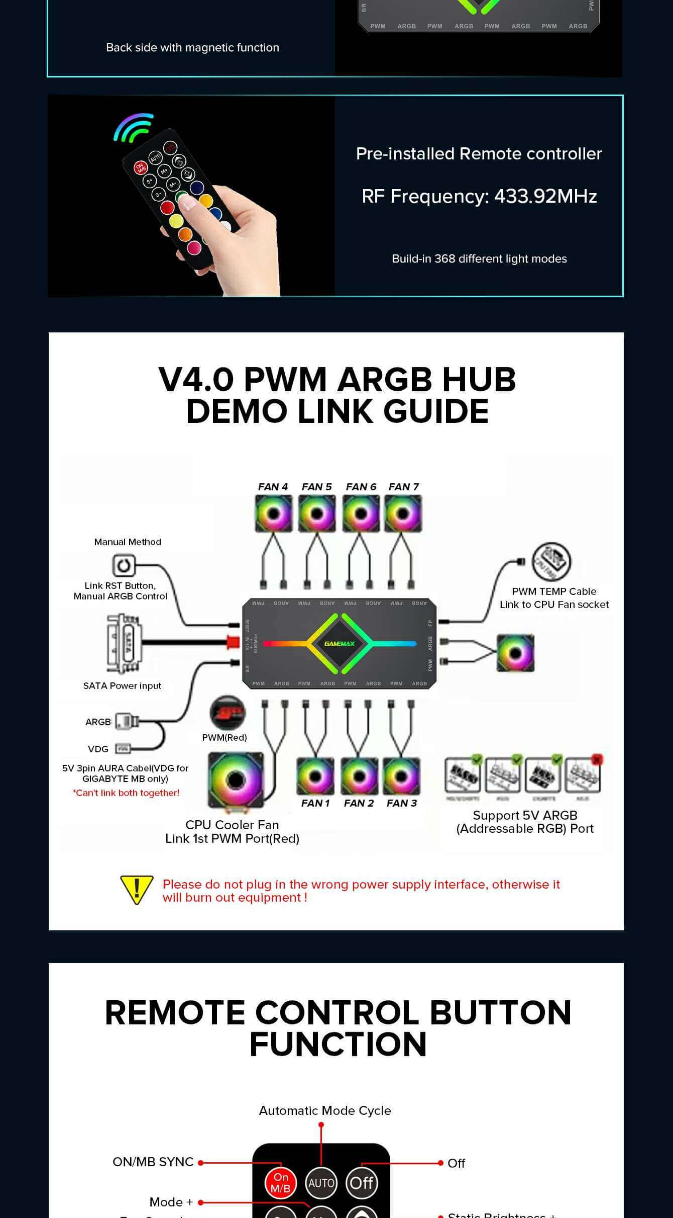 • V4.0 ARGB HUB-PWM |5v ARGB Sync, Remote Control multi-featured hub, Magnetic design for easy installation, the magnet at the bottom of the controller can be firmly attached to the metal plate of the chassis, making installation easy!