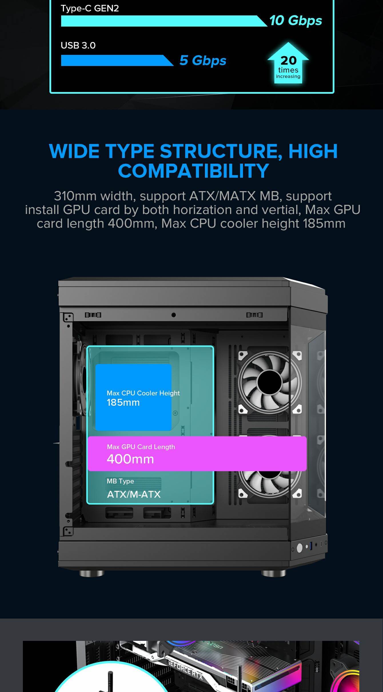• This Mid-tower Case is compatible with the largest NVIDIA 4000 series cards thanks to its ample room for graphics cards up to 400mm in length, and 185mm in height (for air cooling mode)