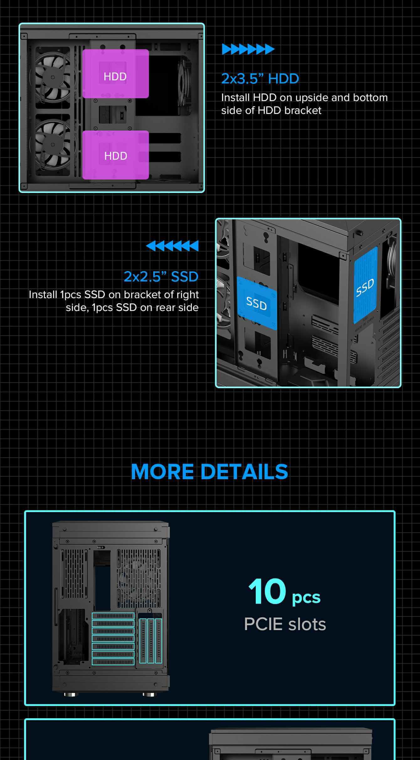 | Slots | 10 slots,(Vertical graphics card support ,Riser Cable option) | |