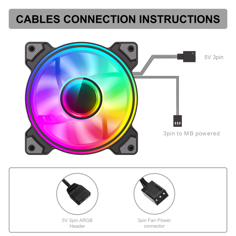 • These fans are 3pin 5v ARGB connectors that connect with ARGB control HUB one by one