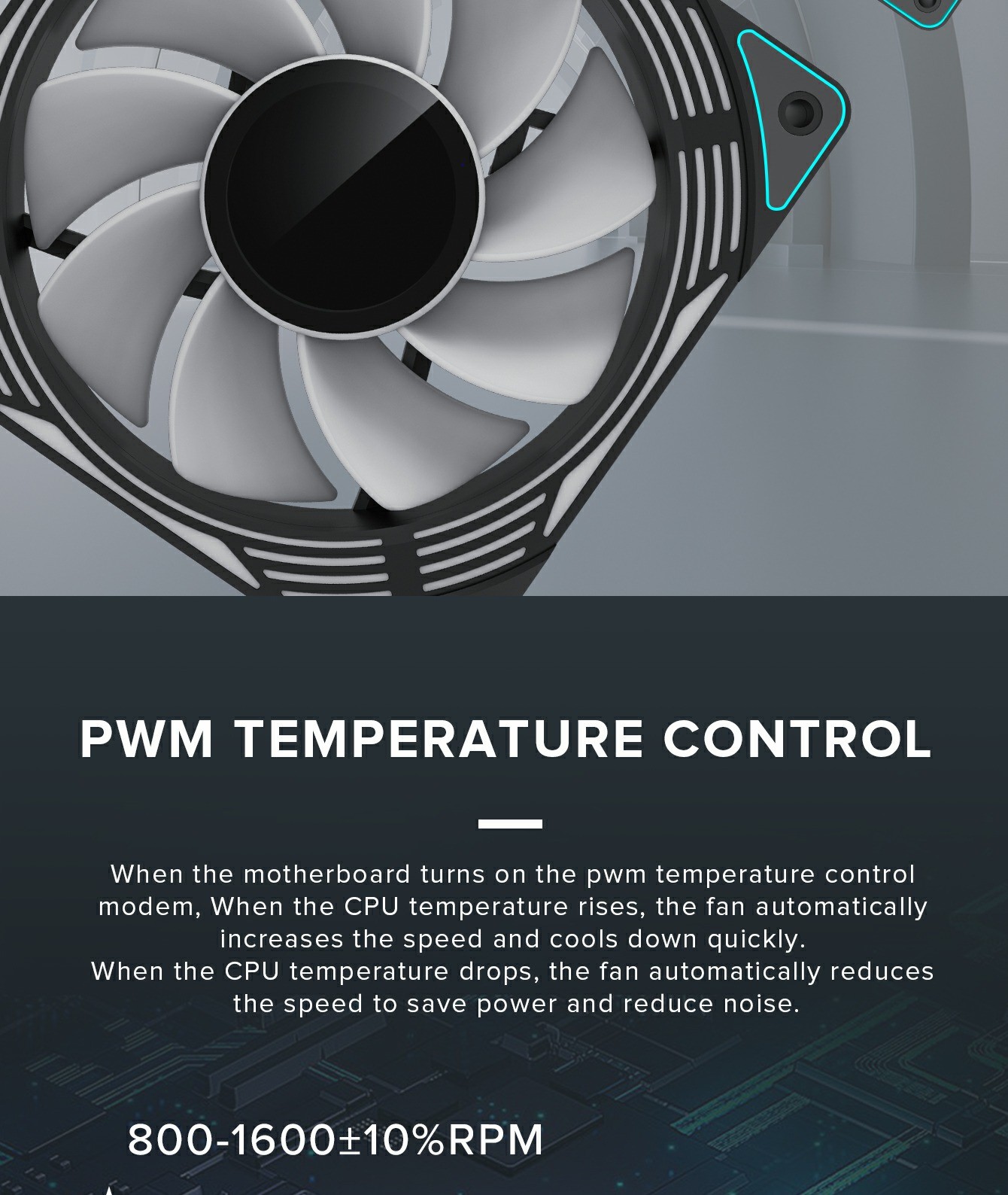 • The intelligent temperature controls the speed at 800~1600±10% RPM, by linking to the motherboard PWM 4pin socket, so the fan speed auto controlled and keeps the fans quiet
