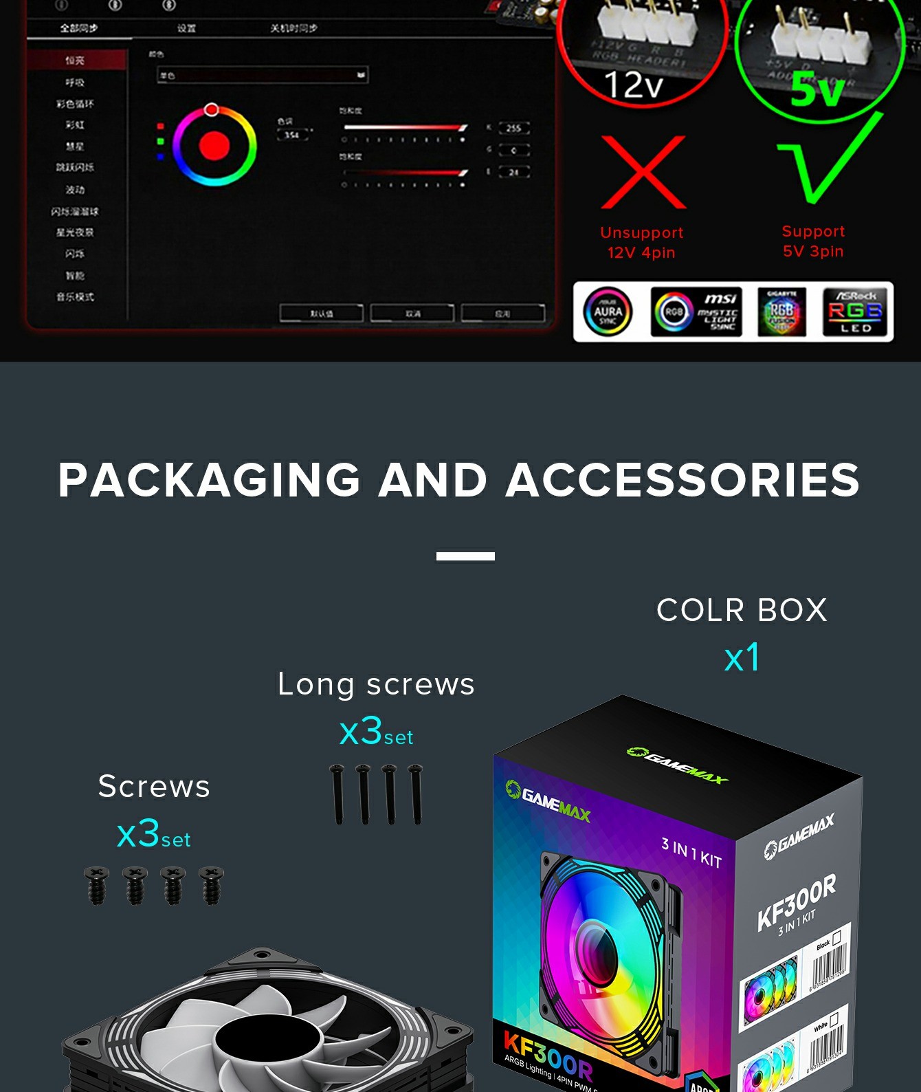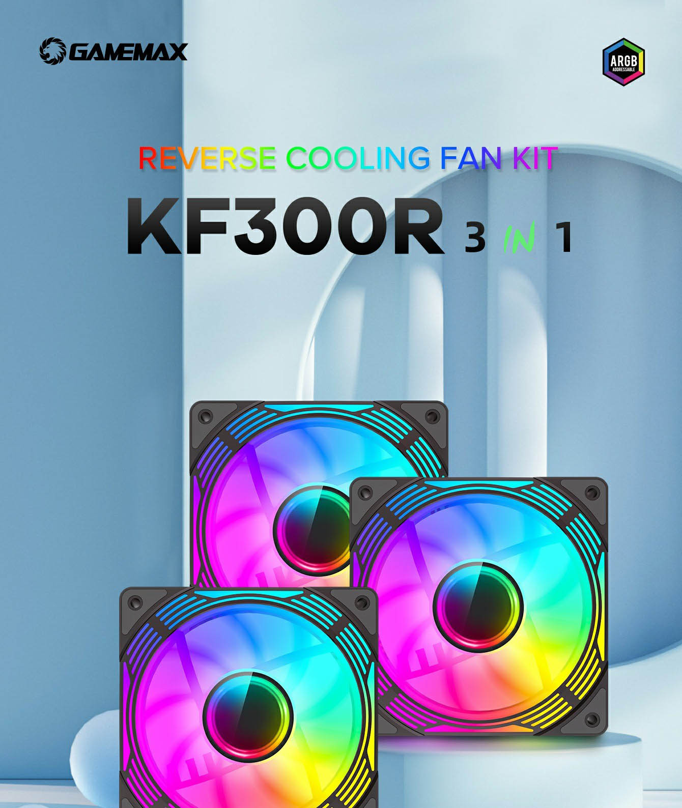GameMax KF300R BK, Reverse 120mm Black frame ARGB Fan 3 in 1 Kit, -Reverse Fan Blade for Power Supply Shroud /Bottom plate of Case for Air Intakes!