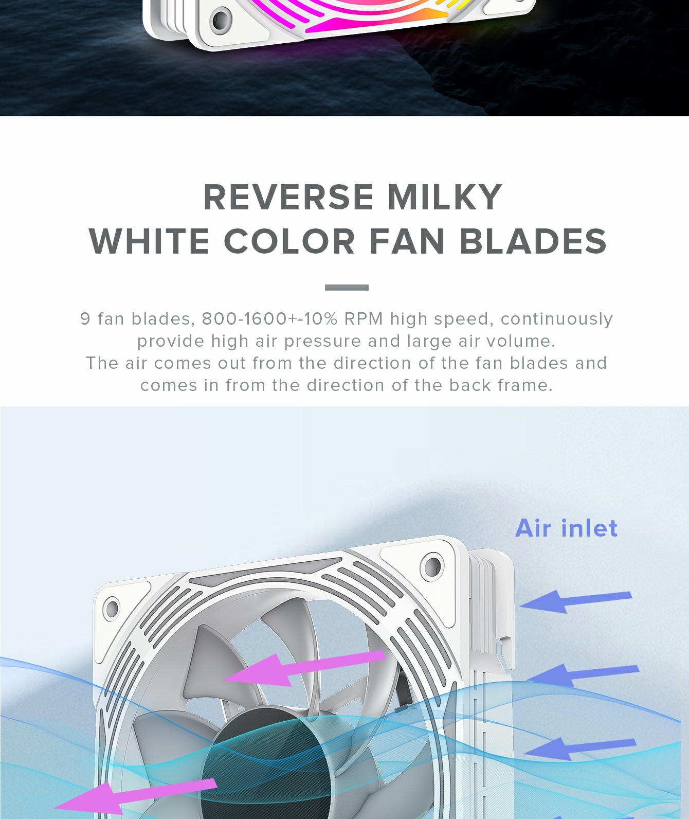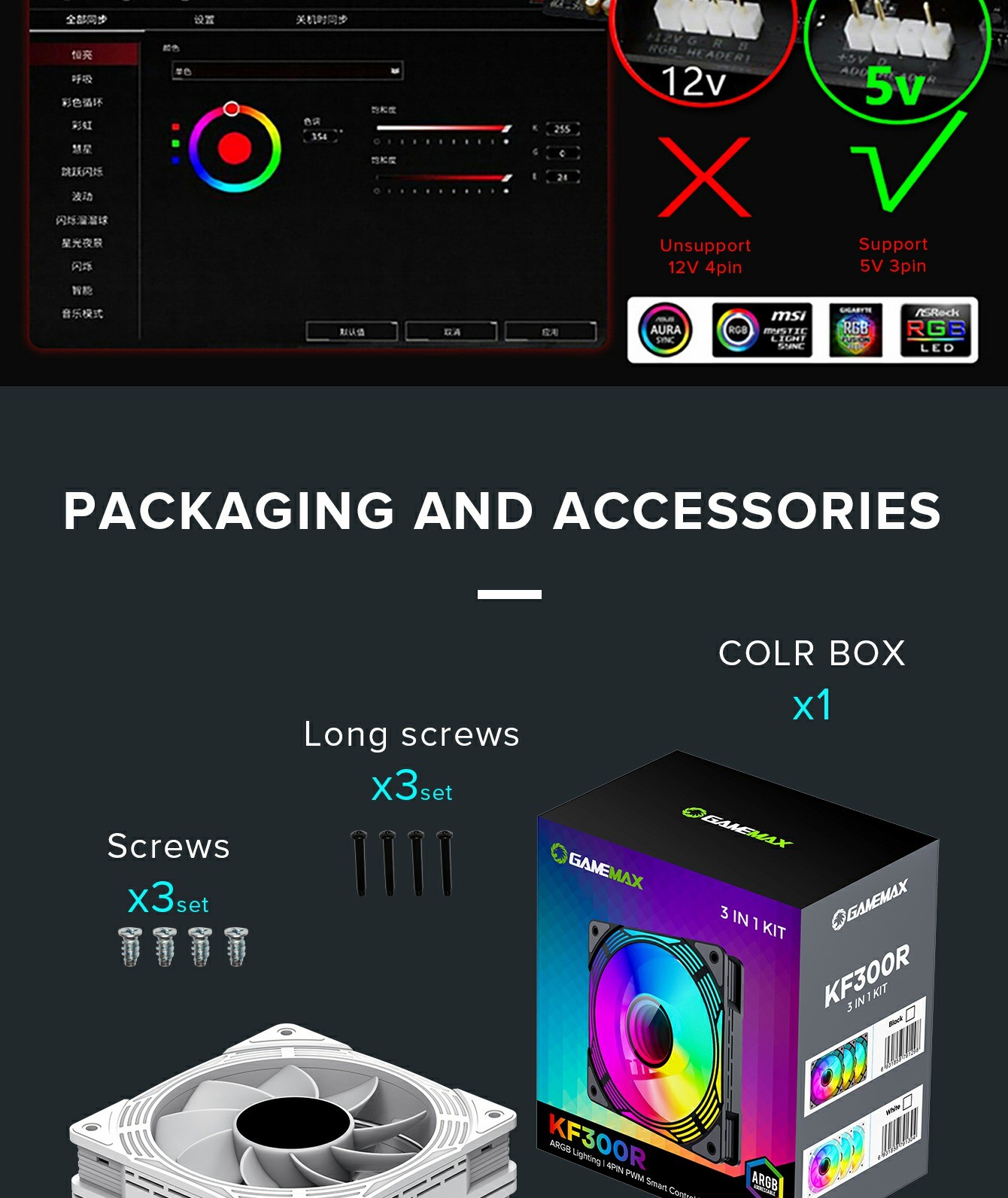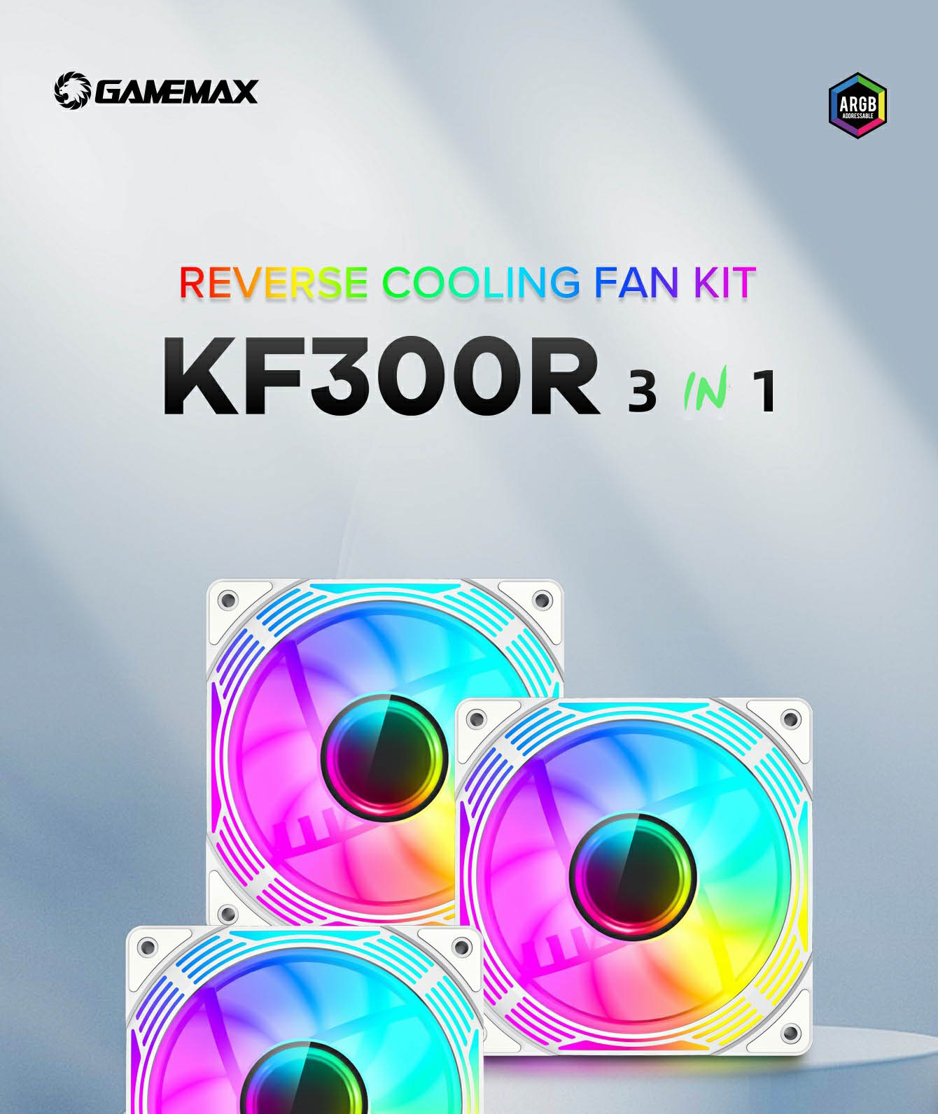 GameMax KF300R WH, Reverse 120mm White frame ARGB Fan 3 in 1 Kit, -Reverse Fan Blade for Power Supply Shroud /Bottom plate of Case for Air Intakes!