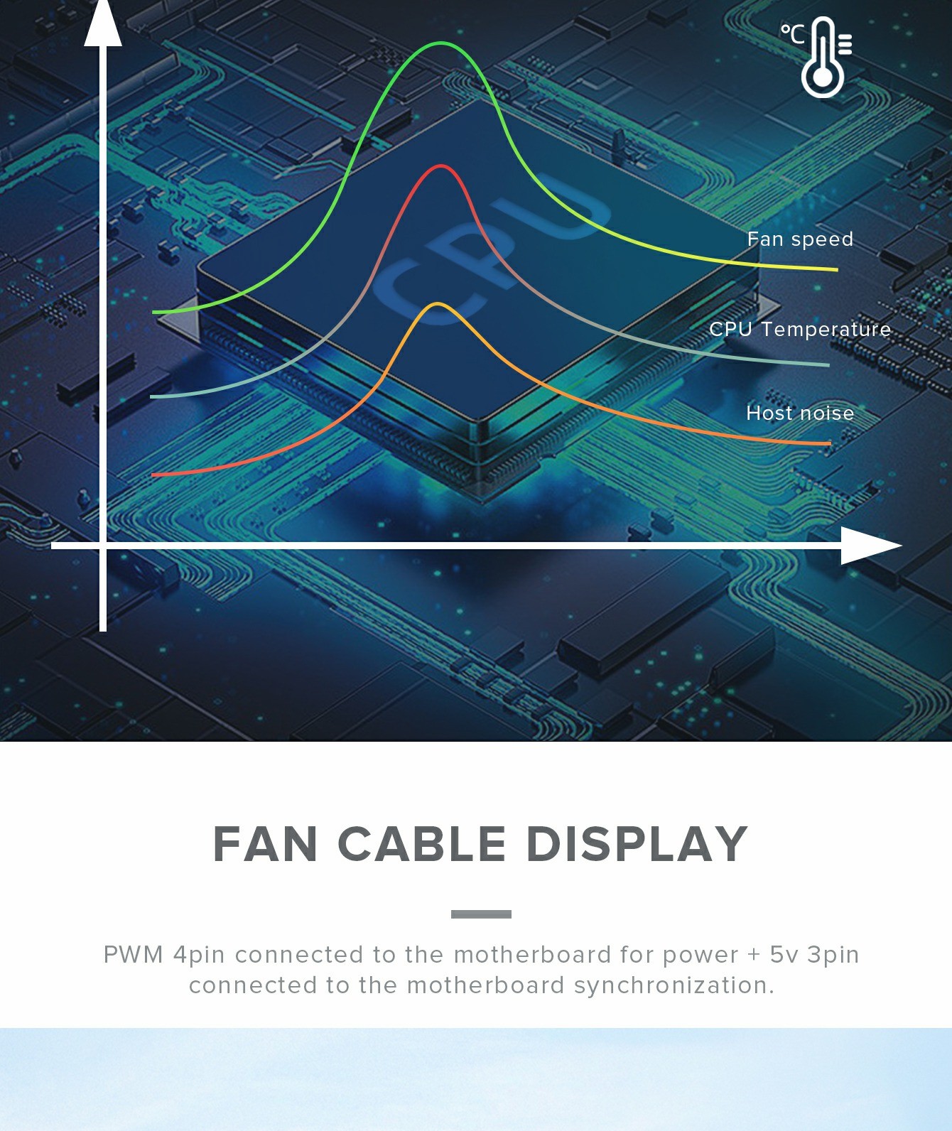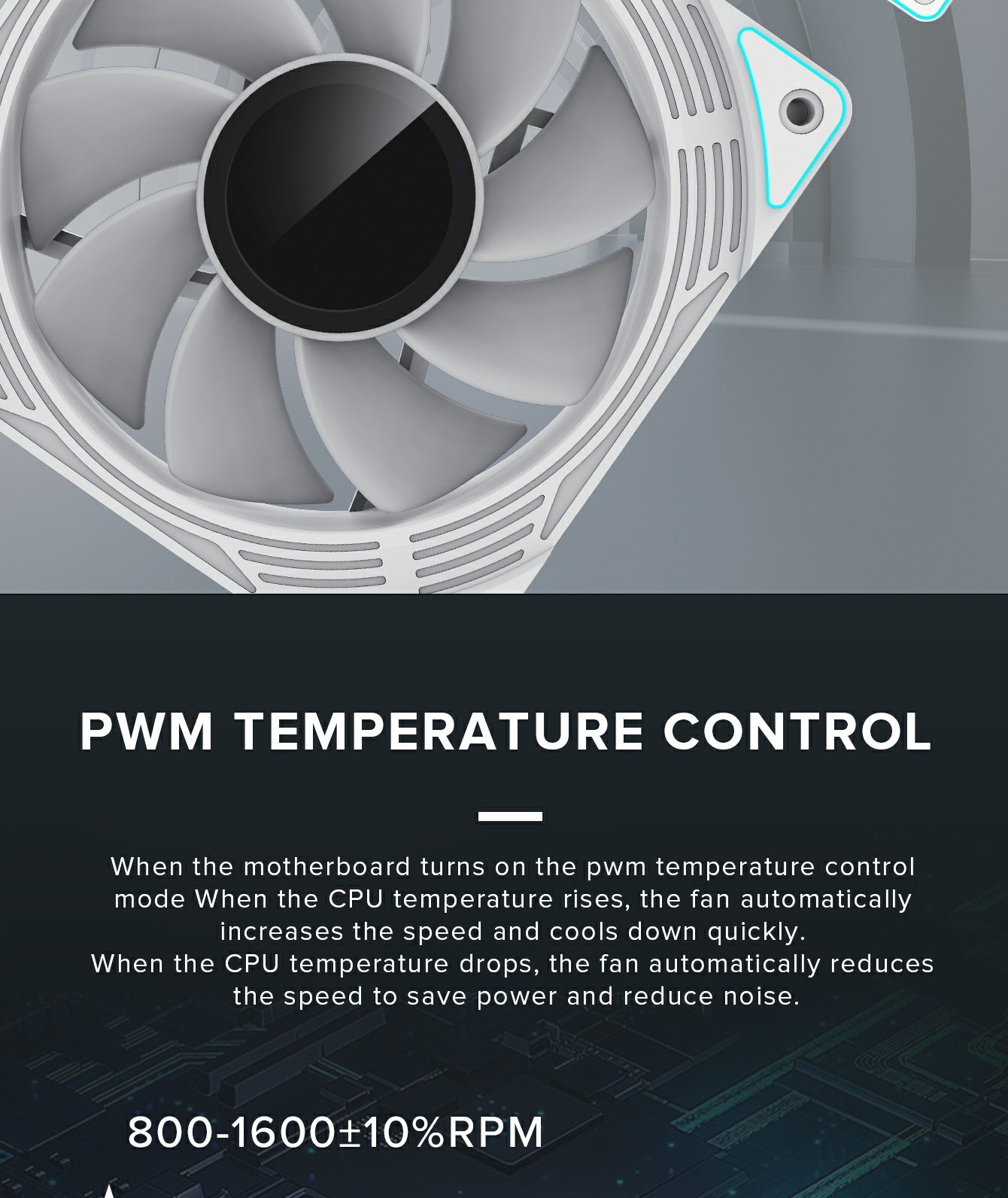 • The intelligent temperature controls the speed at 800~1600±10% RPM, by linking to the motherboard PWM 4pin socket, so the fan speed auto controlled and keeps the fans quiet