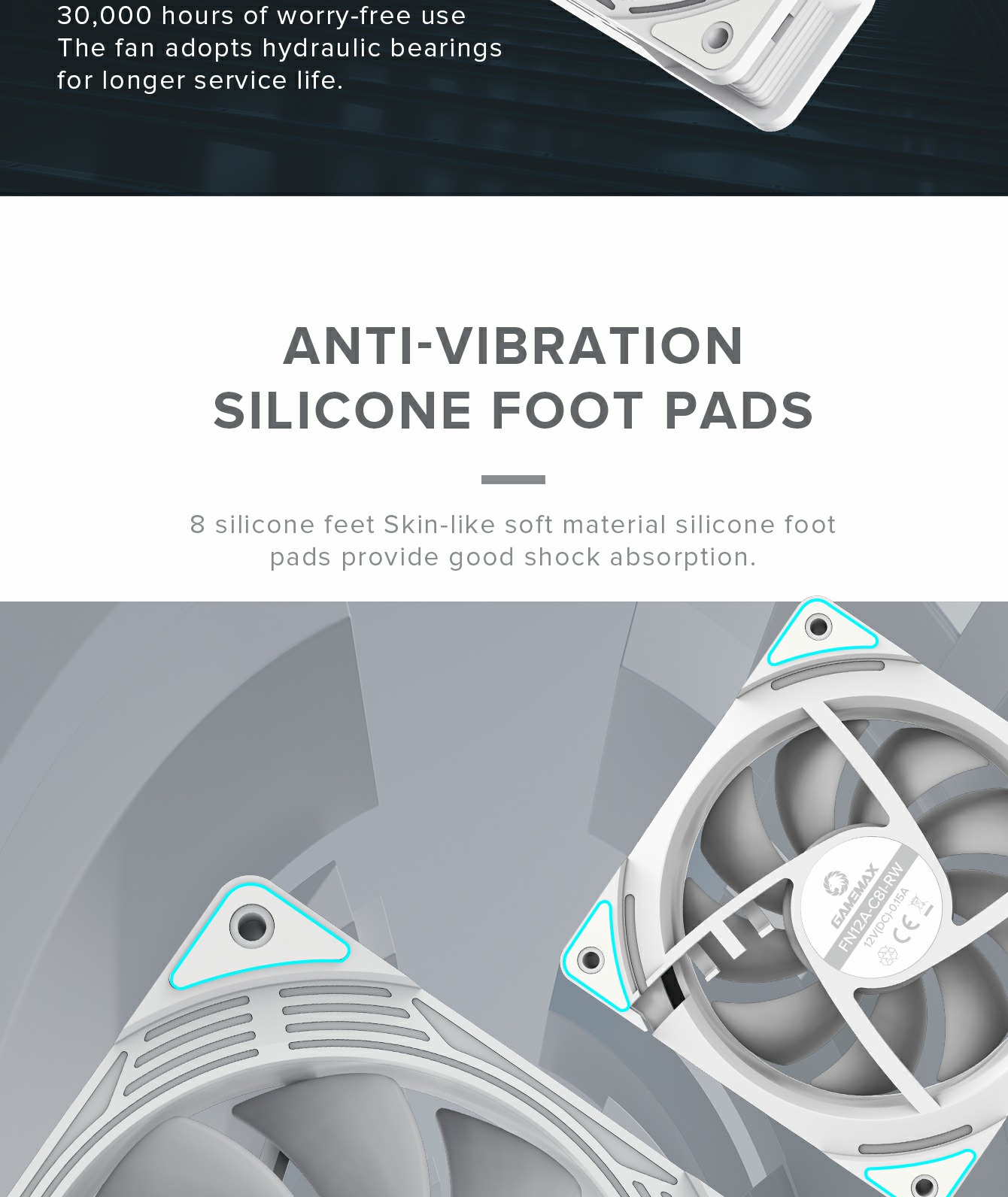 • 【Shockproof Design】The fan frame is fixed on both sides with 8 pieces of shock-absorbing rubber pads