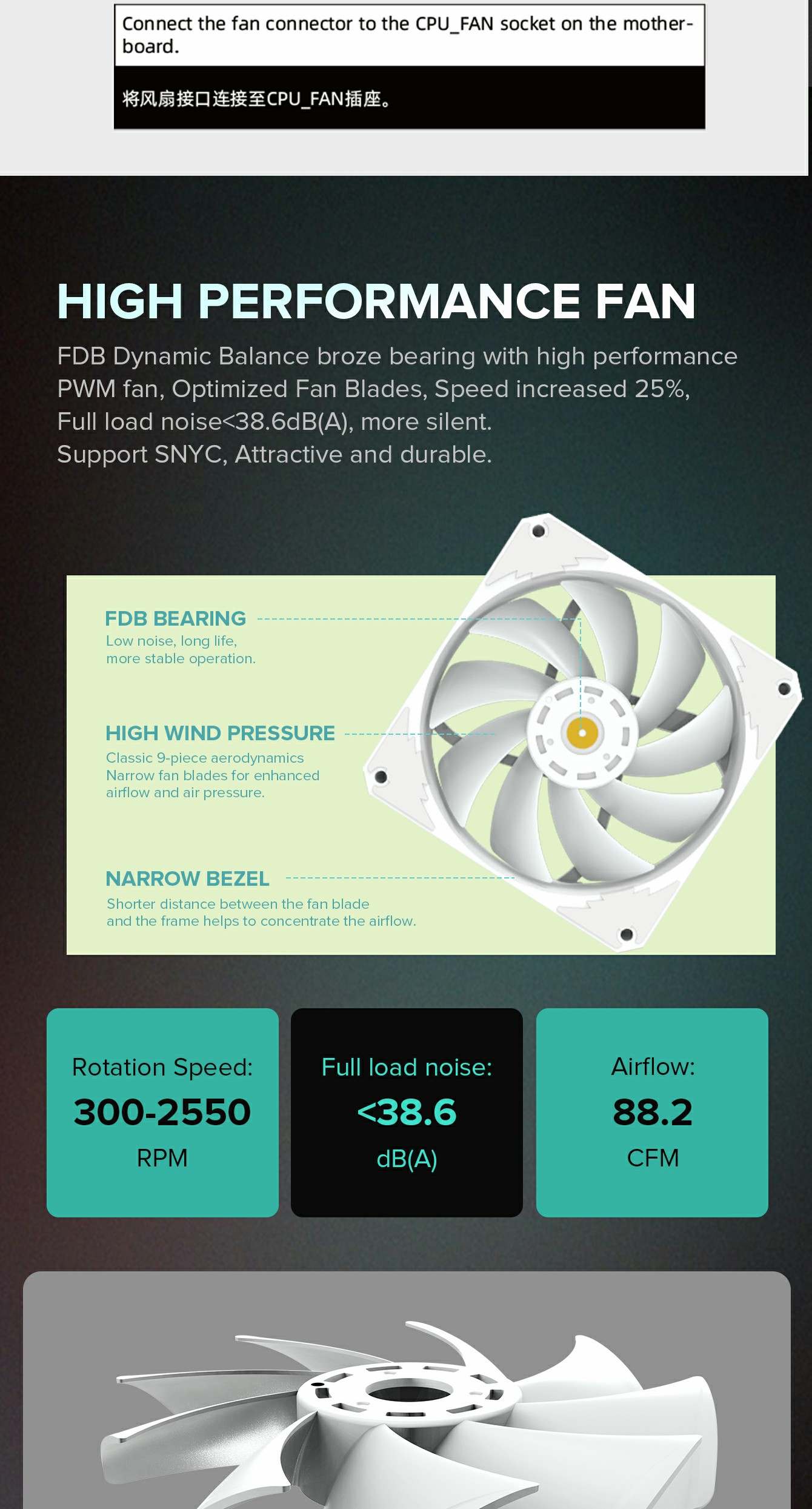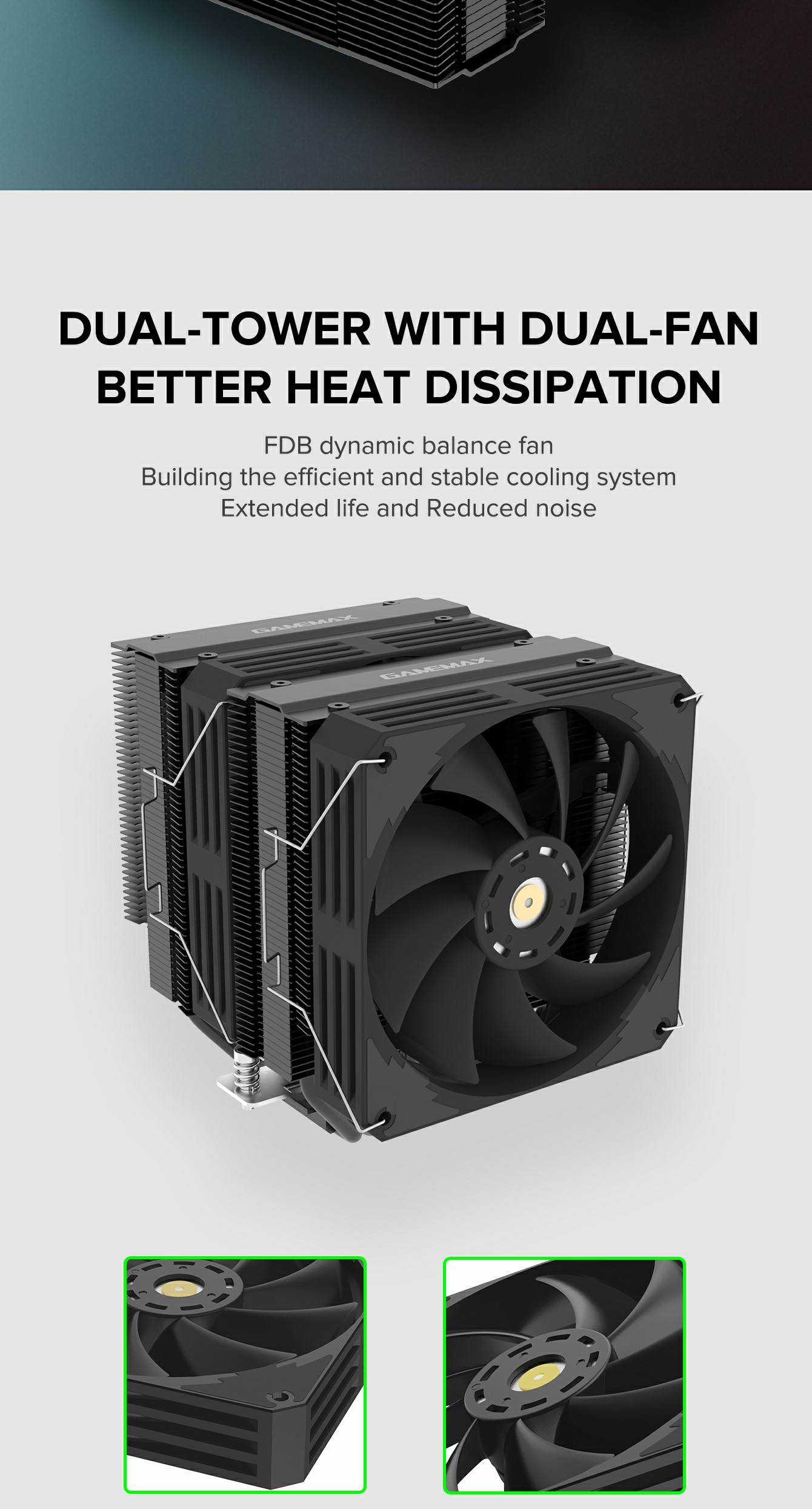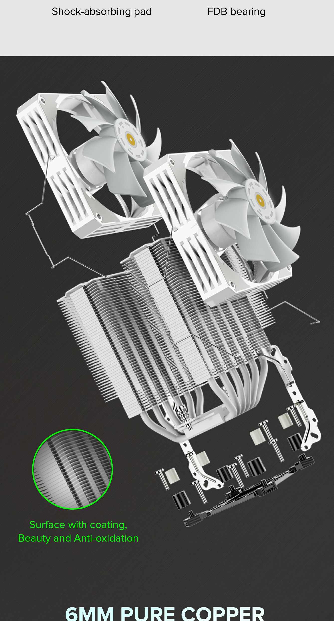 • Proven premium heatsink, now available in an all-white design that goes great with many color schemes, Dual fans adjust speed according to CPU temperature, optimizing cooling efficiency and reducing noise