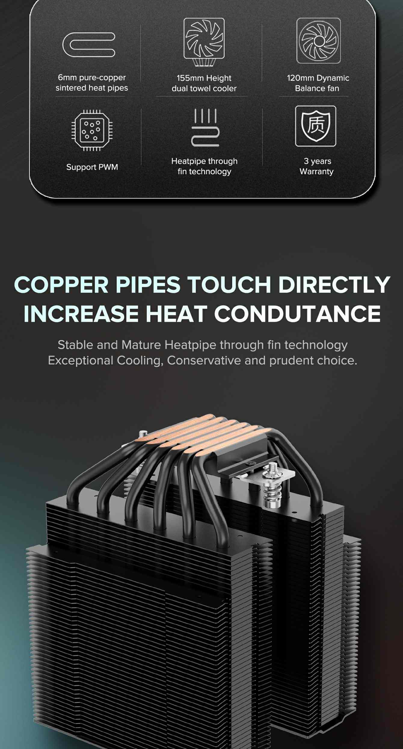 • Asymmetrical, single-fan design for dual-tower performance with high compatibility: 155mm height fits most tower cases, 65mm RAM clearance, does not block the PCIe slot on most ATX Micro-ATX boards