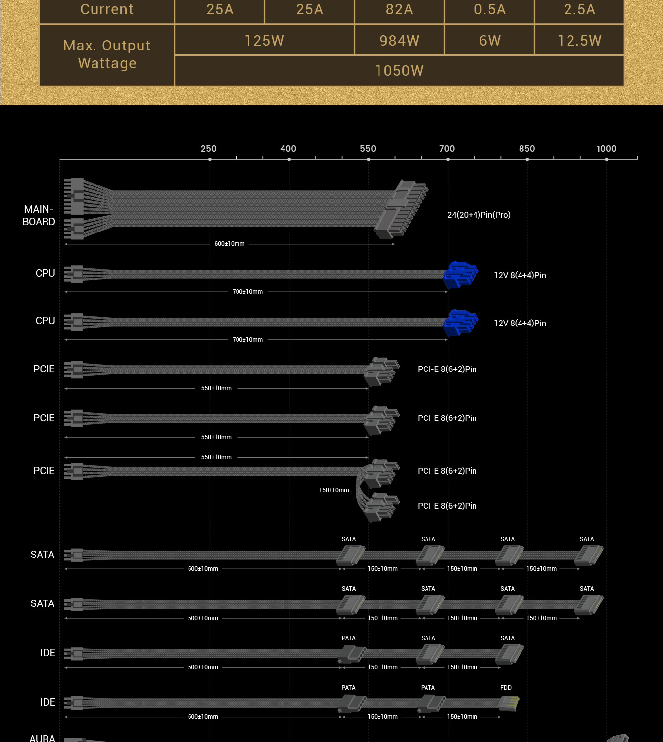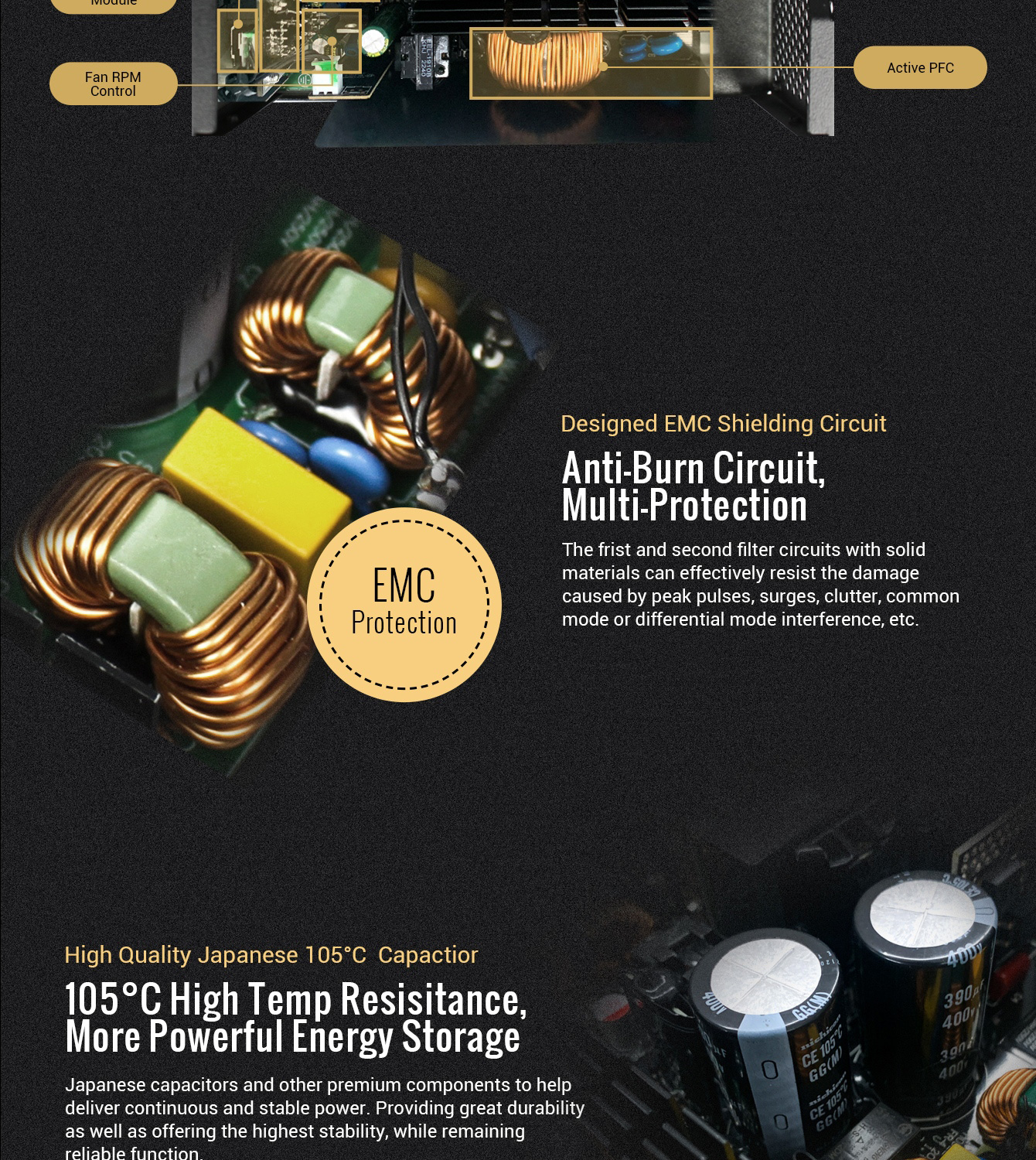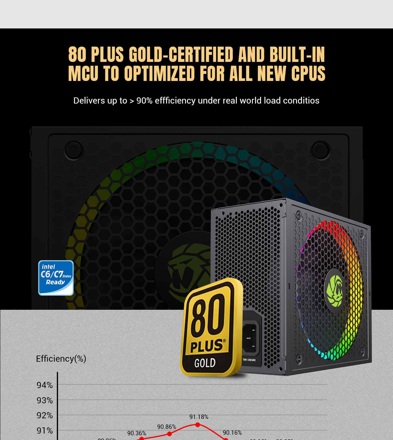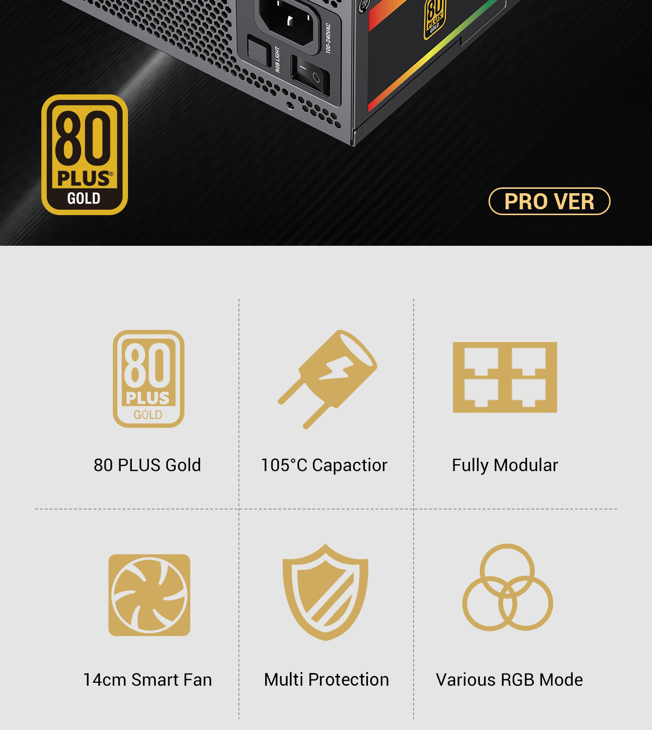 • 80 Plus Gold Certified: RGB-1050 PRO uses the main Japan Capacitor with 90% efficiency or higher under typical loads