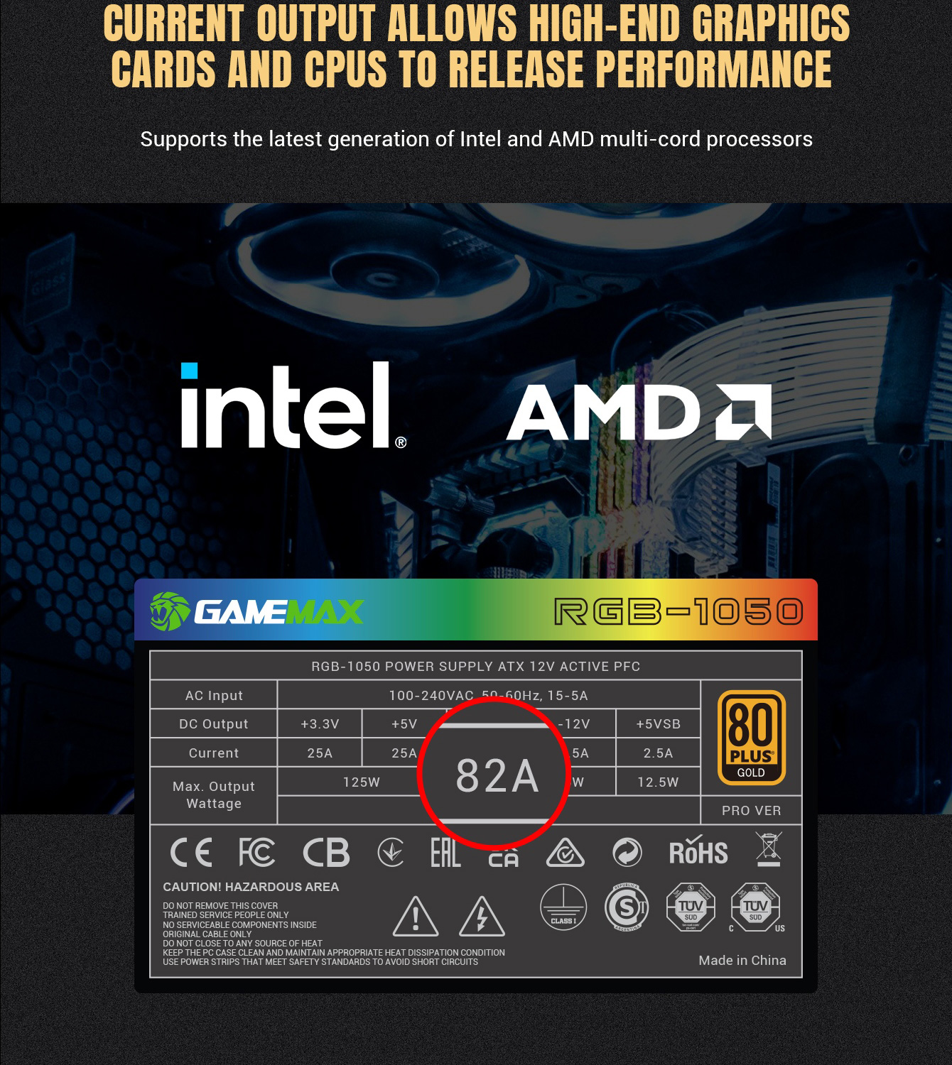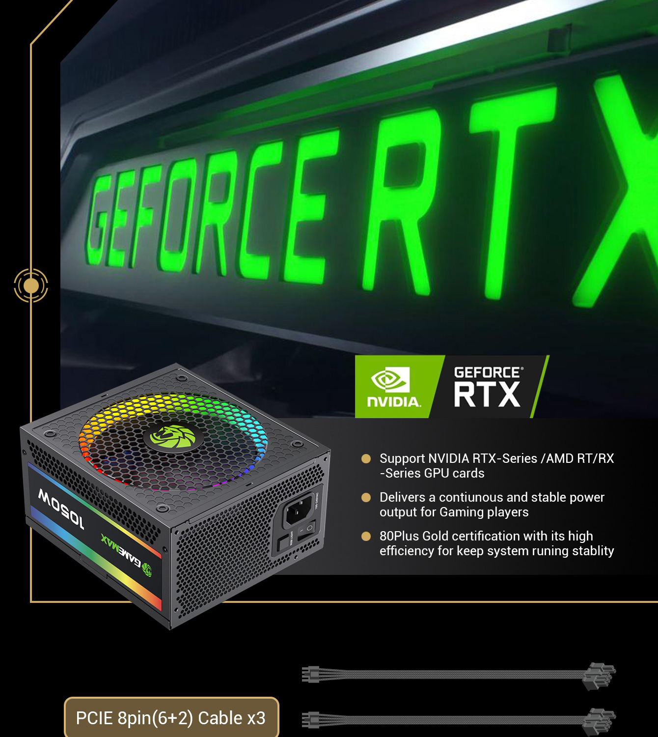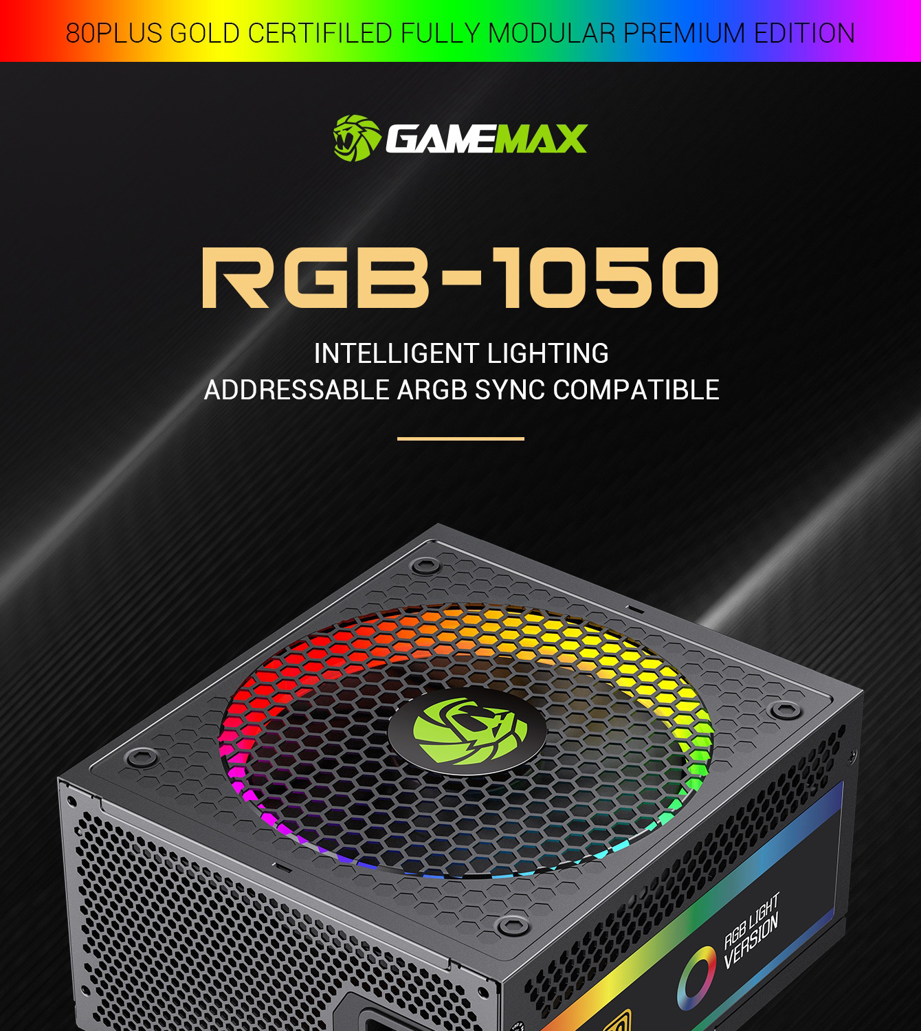 Gamemax RGB-1050 PRO Fully Modular 80+ Gold Certified, LLC+DC-DC design for Powerful single +12V rail helps ensure a stable and reliable supply to other PC components