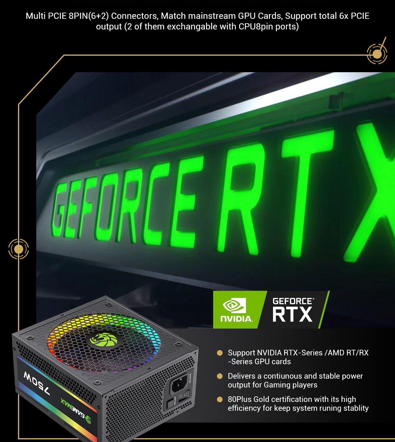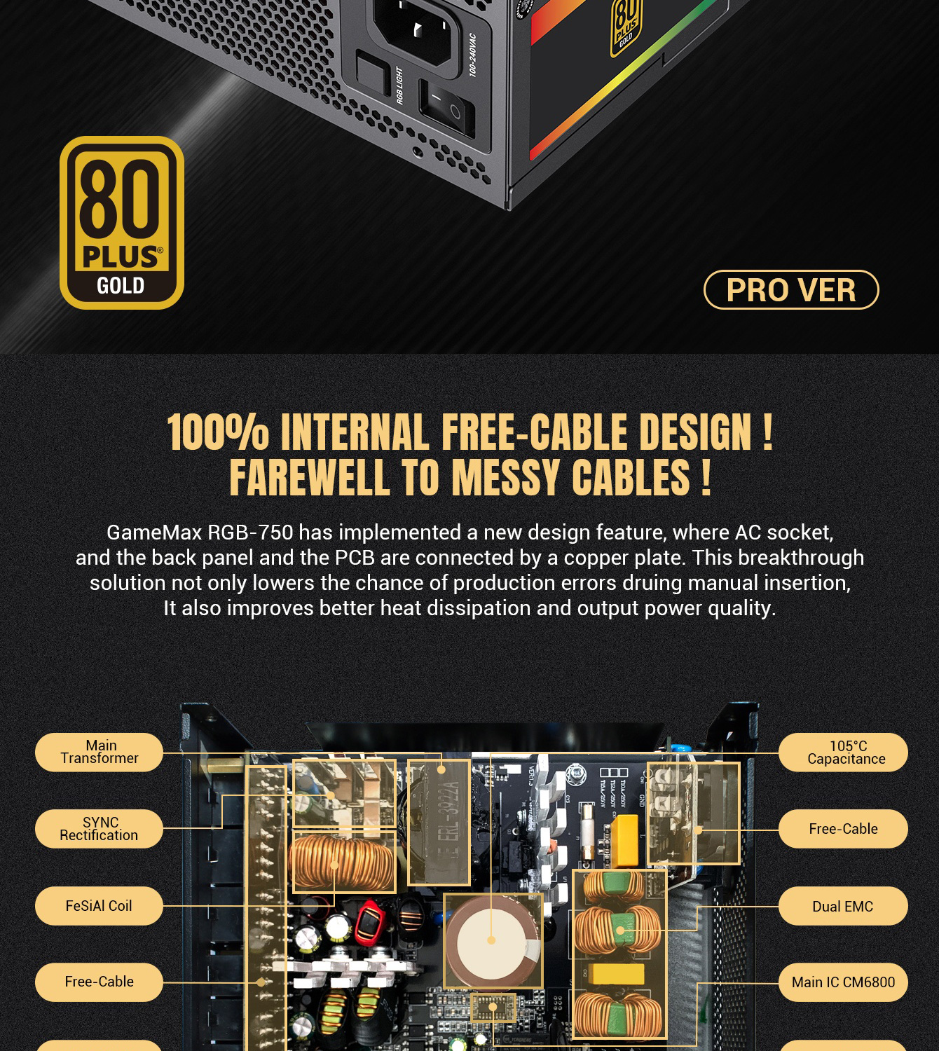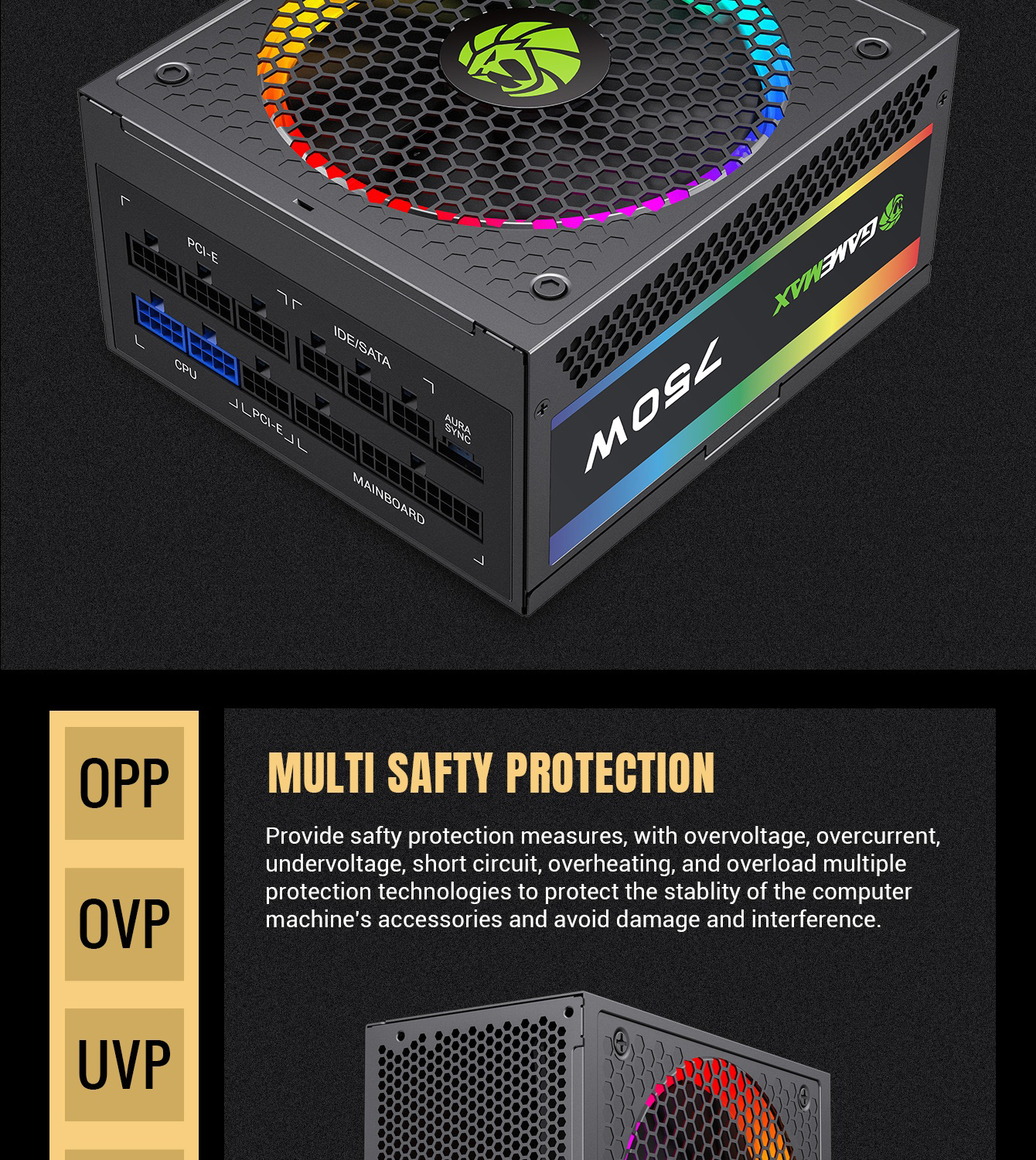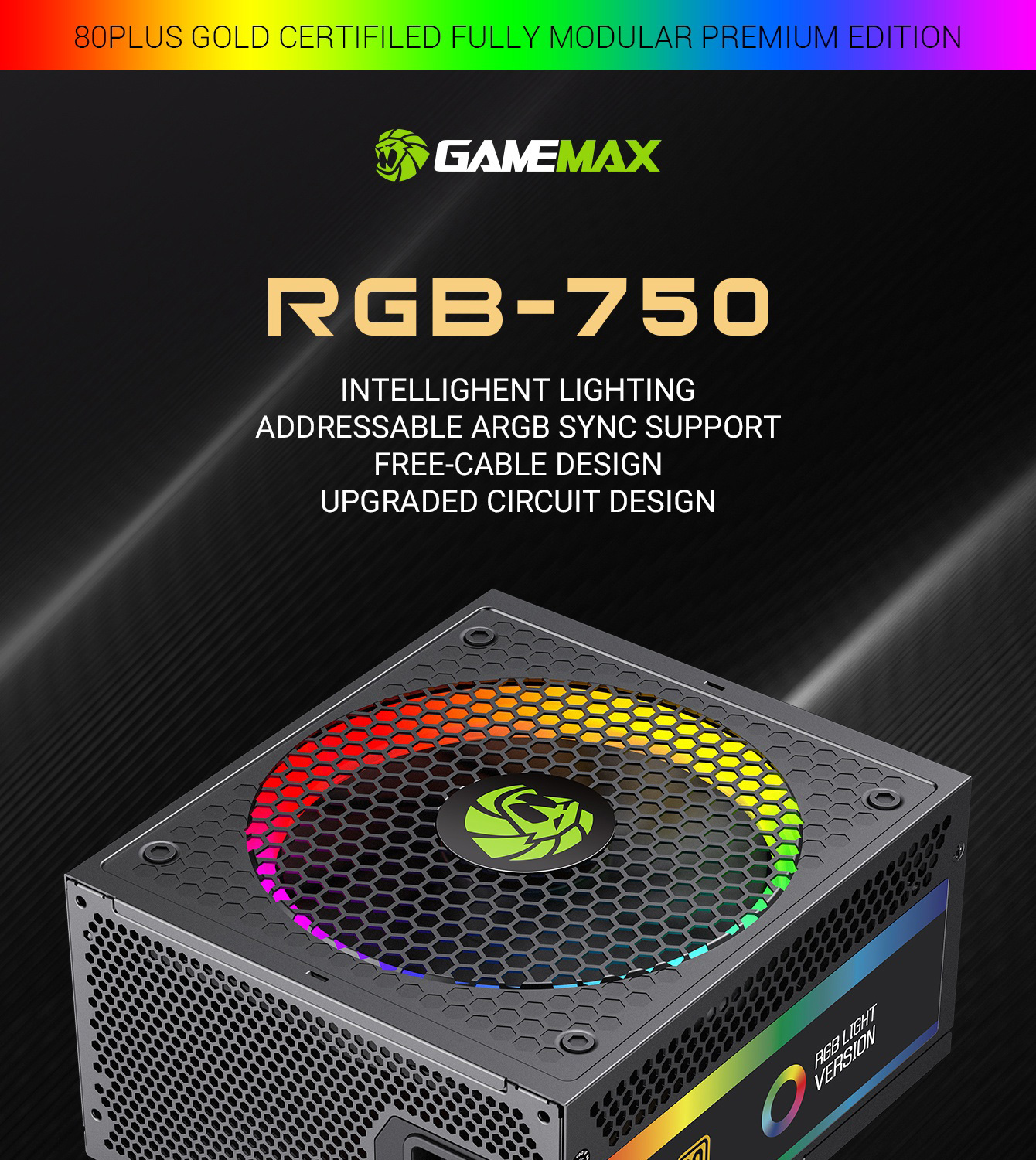 GameMax RGB-750 PRO Fully Modular 80+ Gold Certified,12V SYNC Rectification design for Powerful single +12V rail helps ensure a stable and reliable supply to other PC components