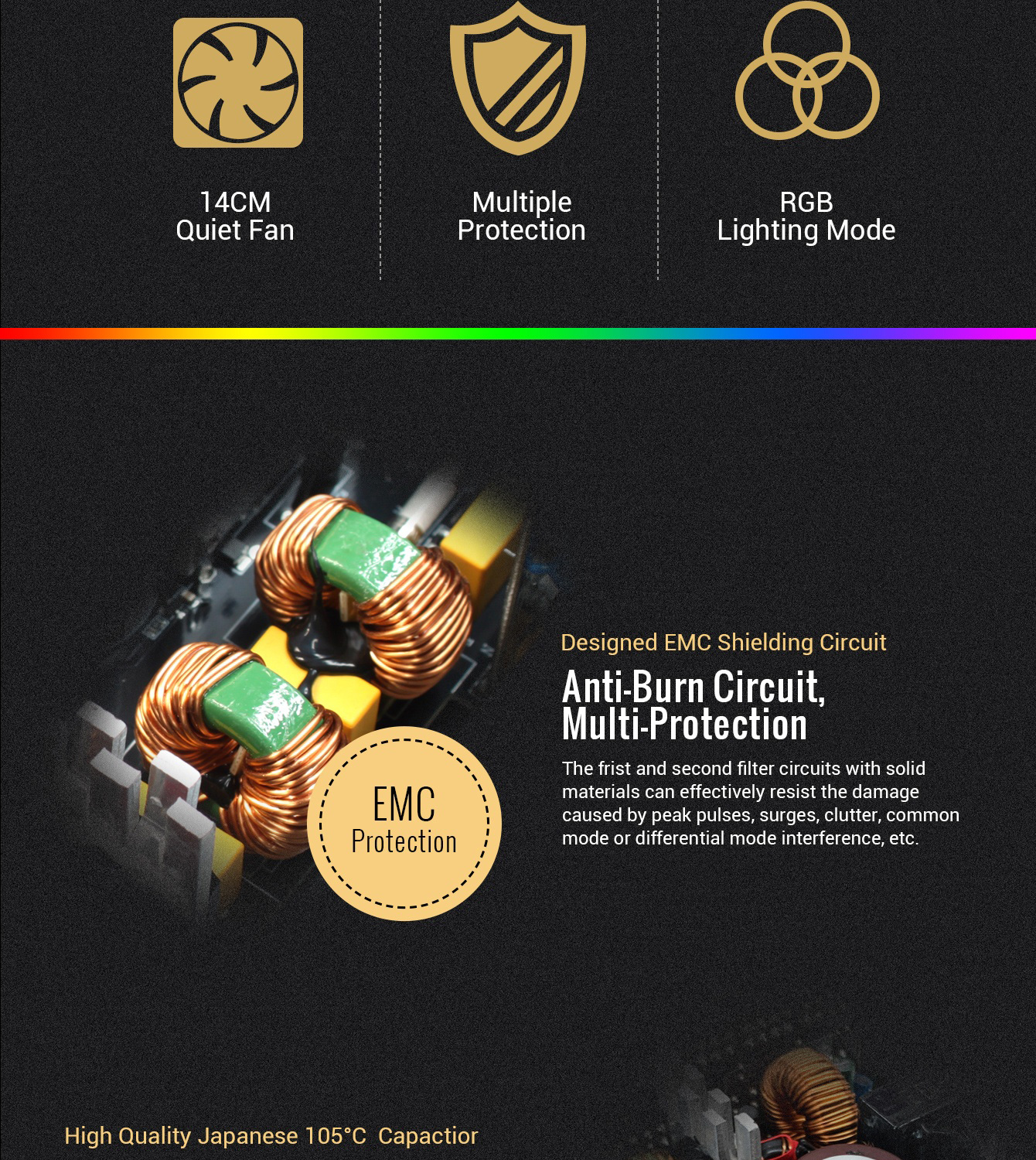 • 80 Plus Gold Certified: RGB-850 PRO uses the main Japan Capacitor with 90% efficiency or higher under typical loads