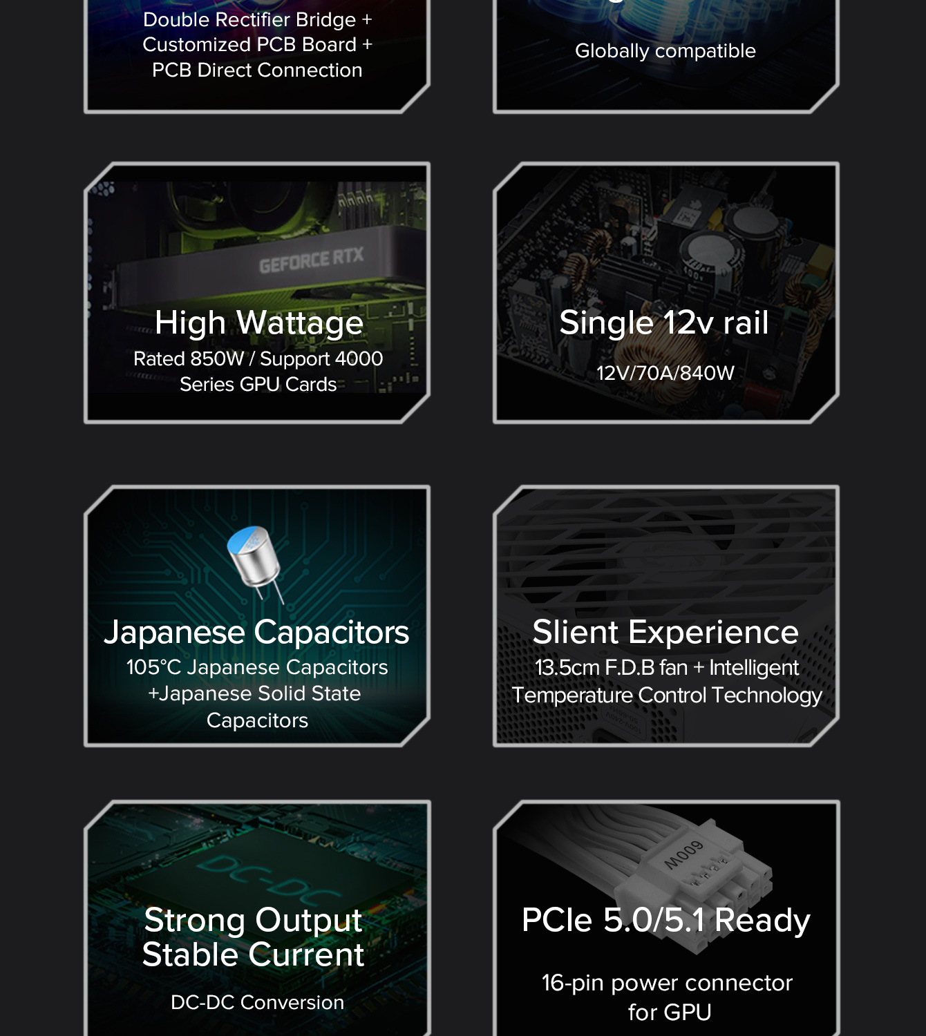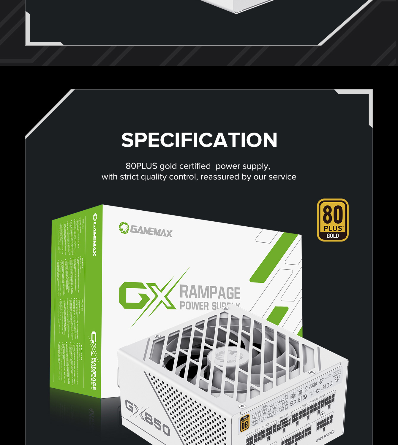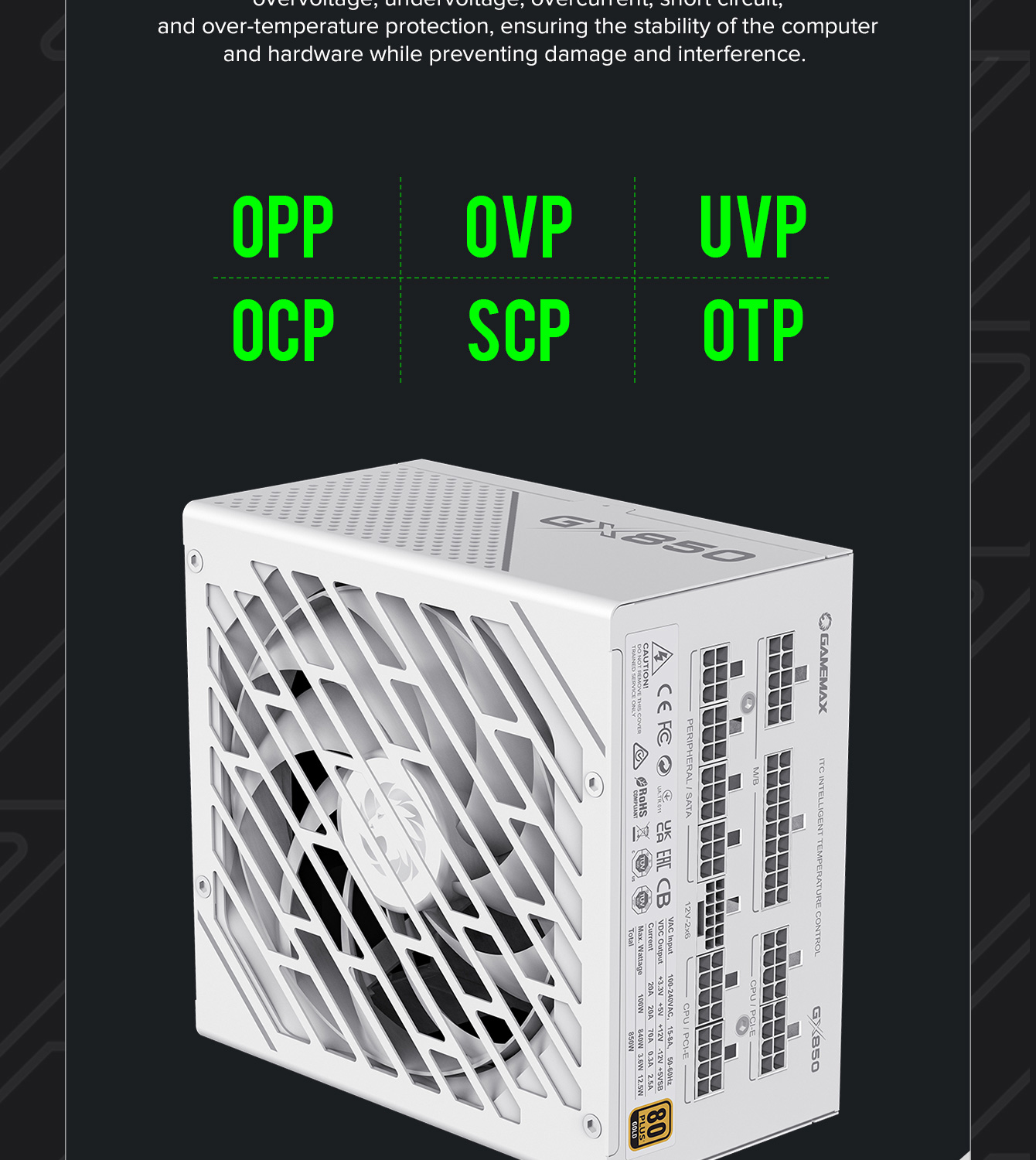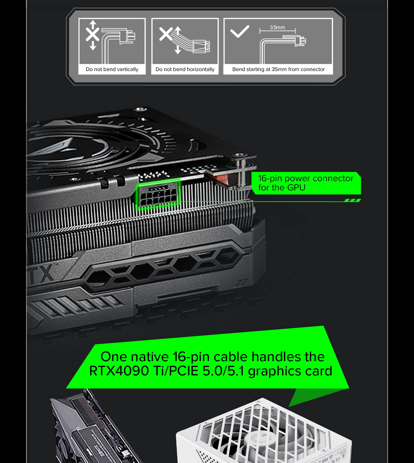 850W 80 Plus Gold ATX3.1 PCIe5.1 power supply with PCIe5.1 12V-2*6 connector for direct RTX™ 40 Series GPU connection, minimizing current loss.