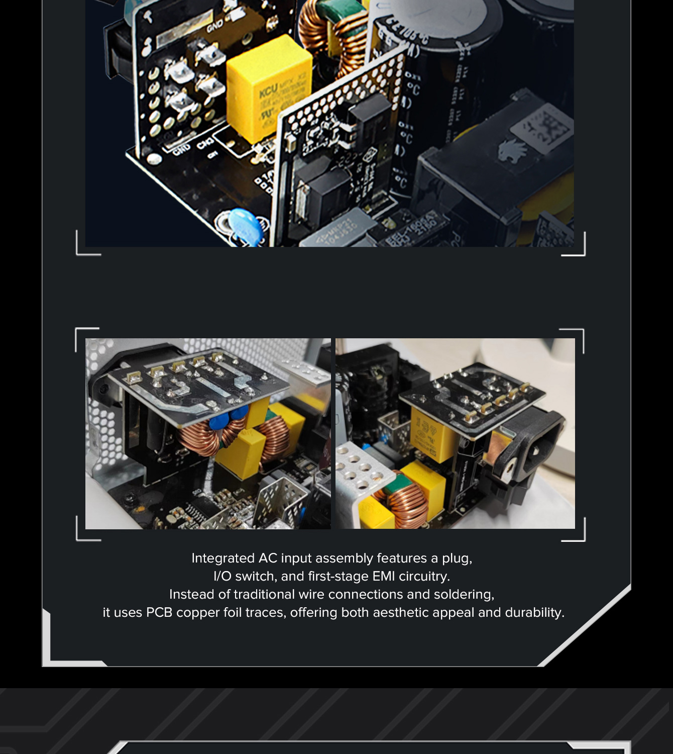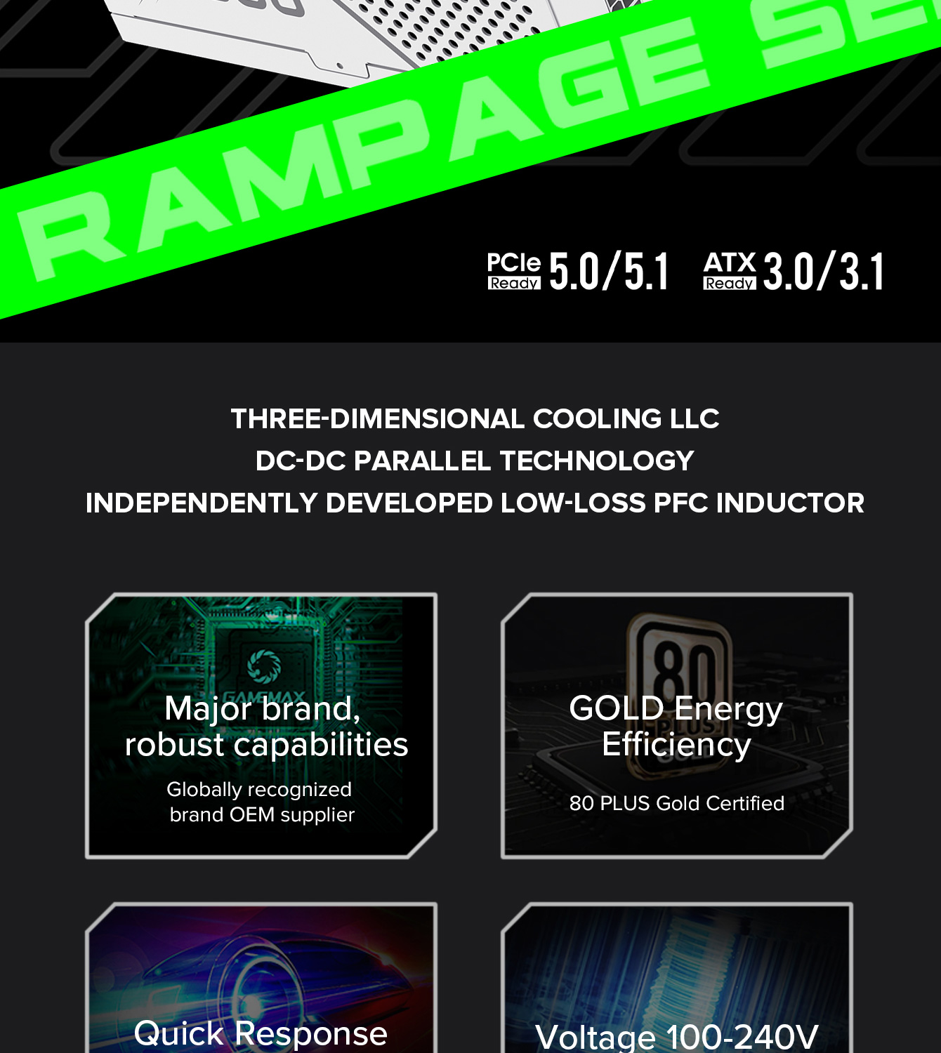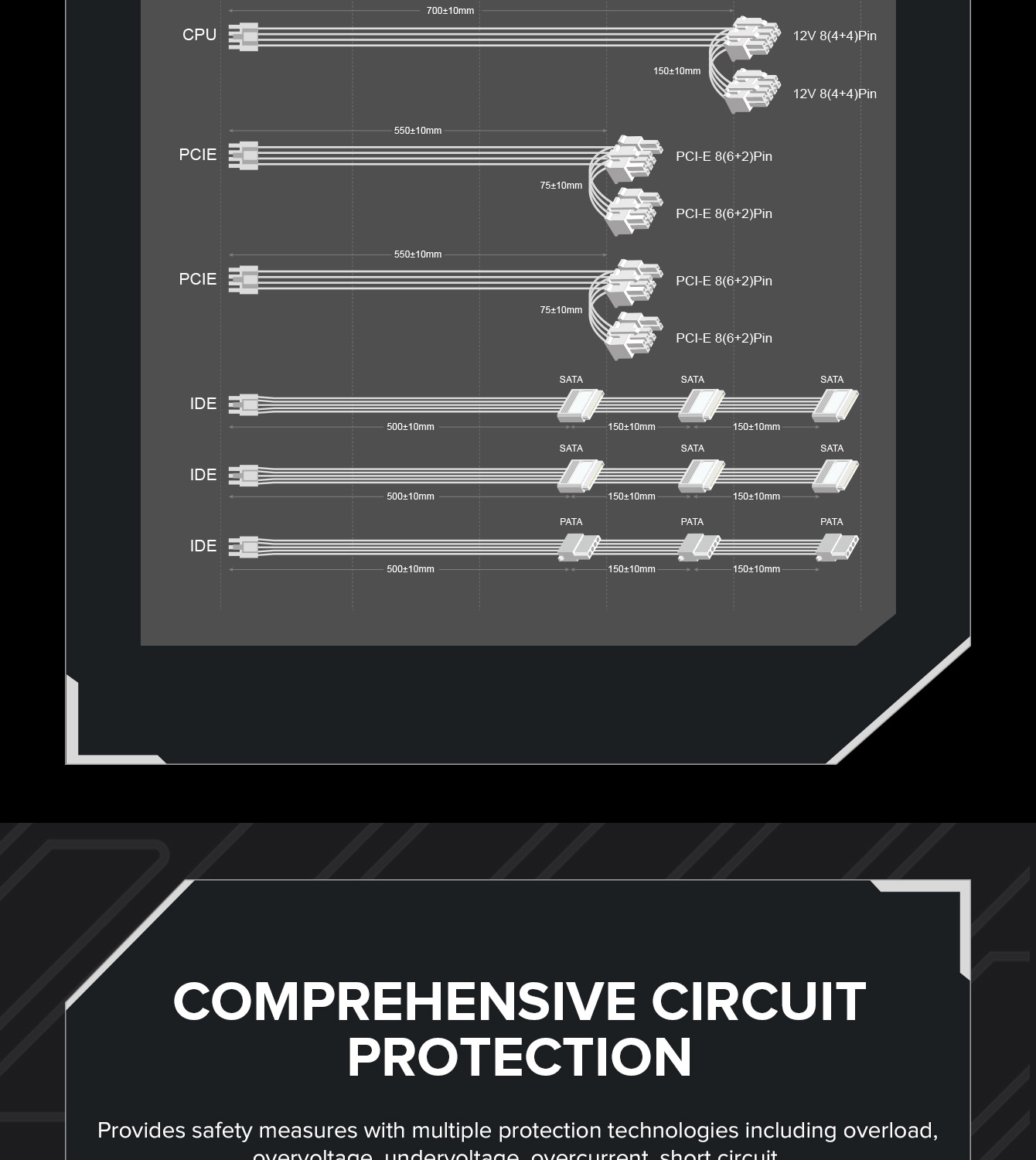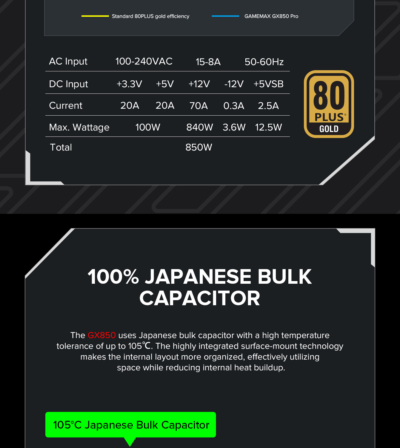 850W 80 Plus Gold ATX3.1 PCIe5.1 power supply with PCIe5.1 12V-2*6 connector for direct RTX™ 40 Series GPU connection, minimizing current loss.