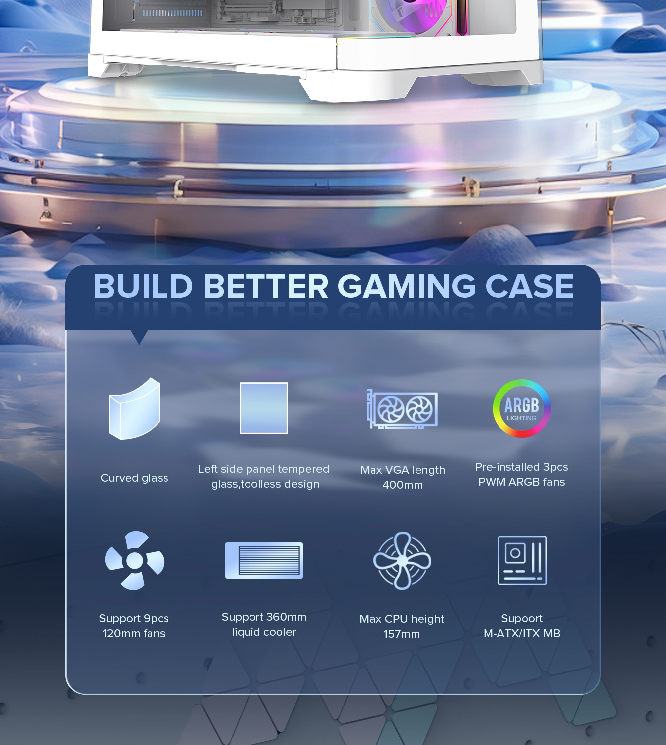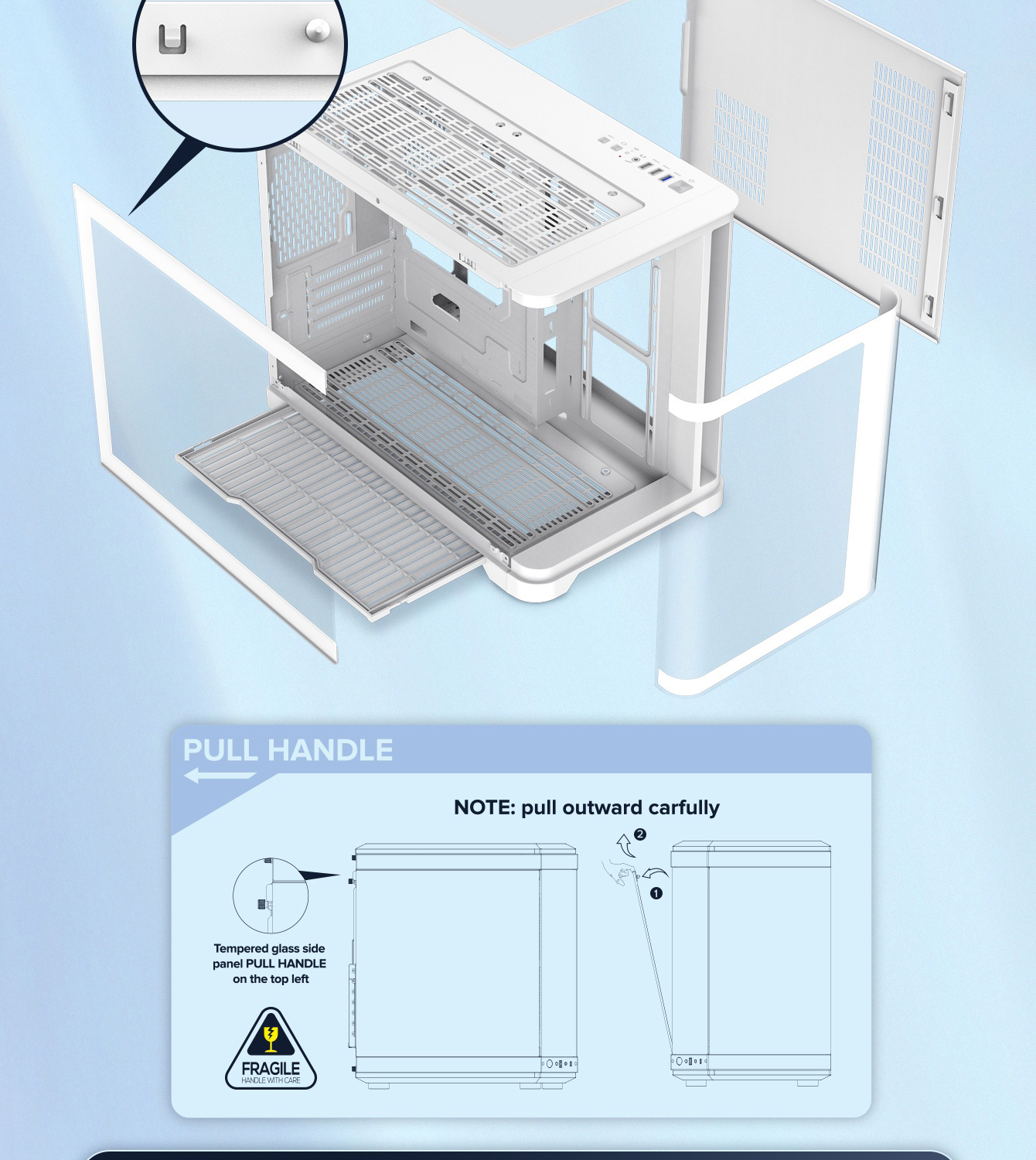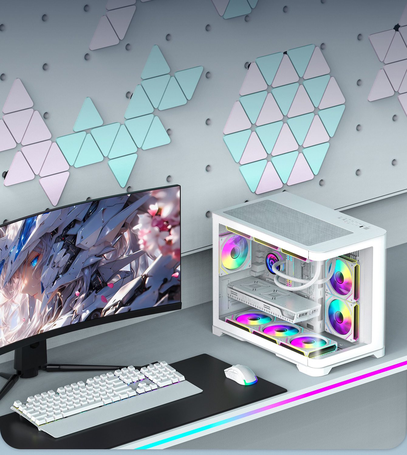 • Computer Case Focus on Cooling- 3 x pre-installed 120mm ARGB Fans- 2 beneath the floor, and one at the back of the case