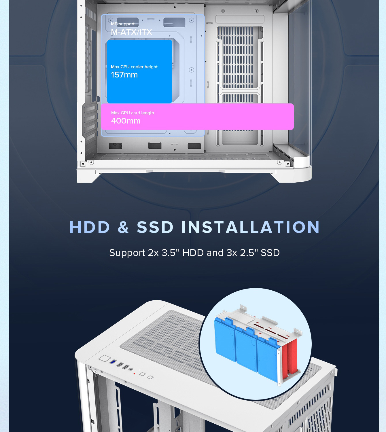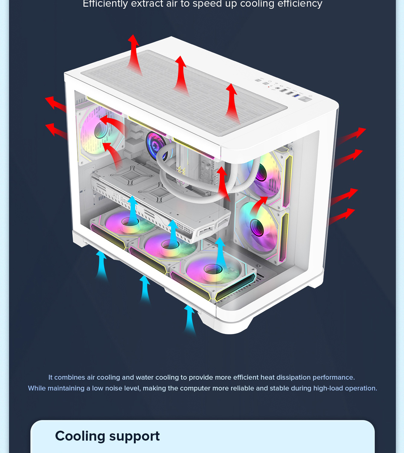 • This Mid-tower Case is compatible with the largest NVIDIA 4000 series cards thanks to its ample room for graphics cards up to 400mm in length, and 157mm in height (for air cooling mode)