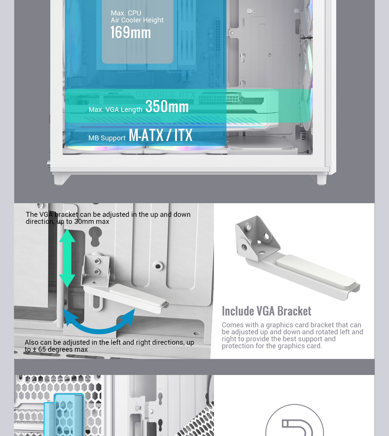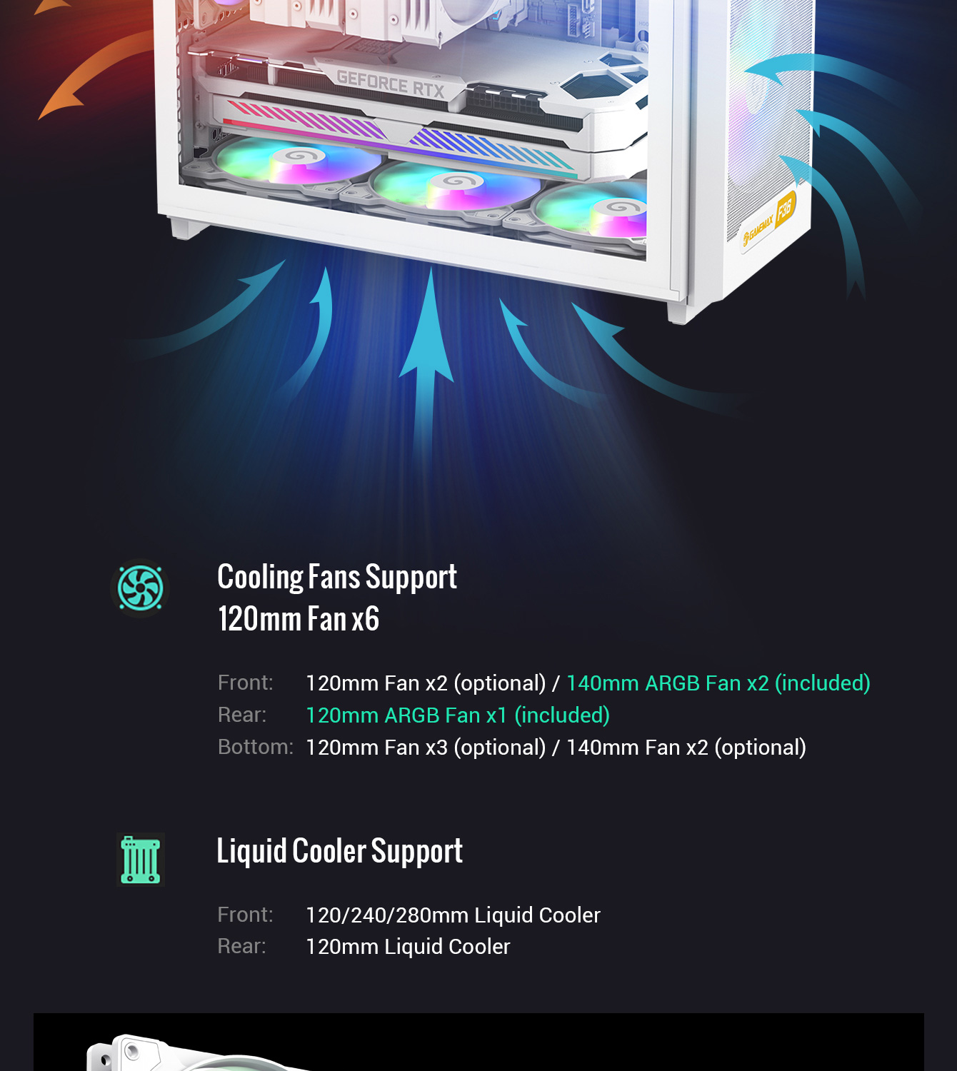 • Supports up to 166mm air coolers and 240/280mm liquid coolers.