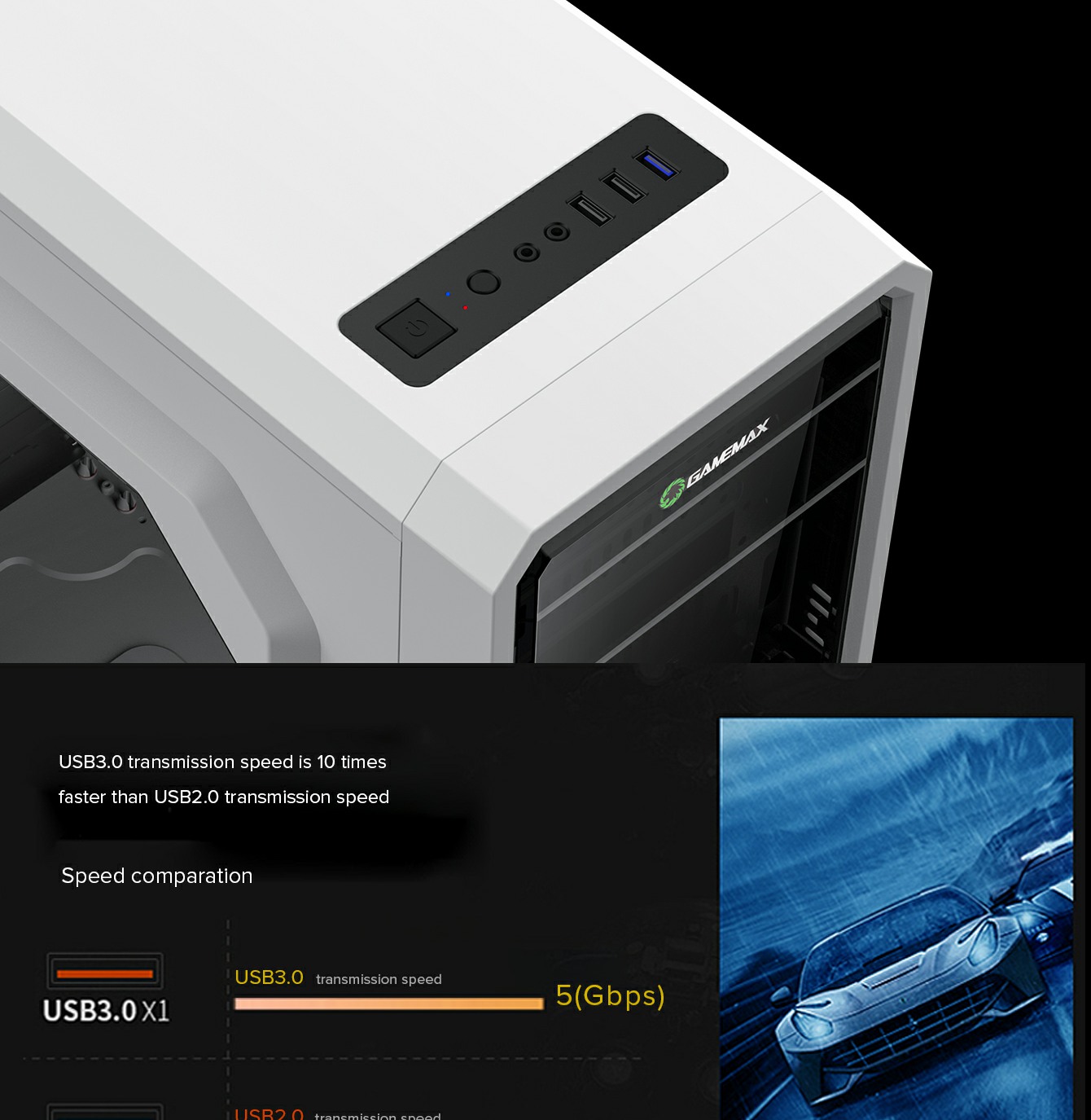 • Front panel: 12cm 15xLeds Blue LED fan *2 (Ring type)