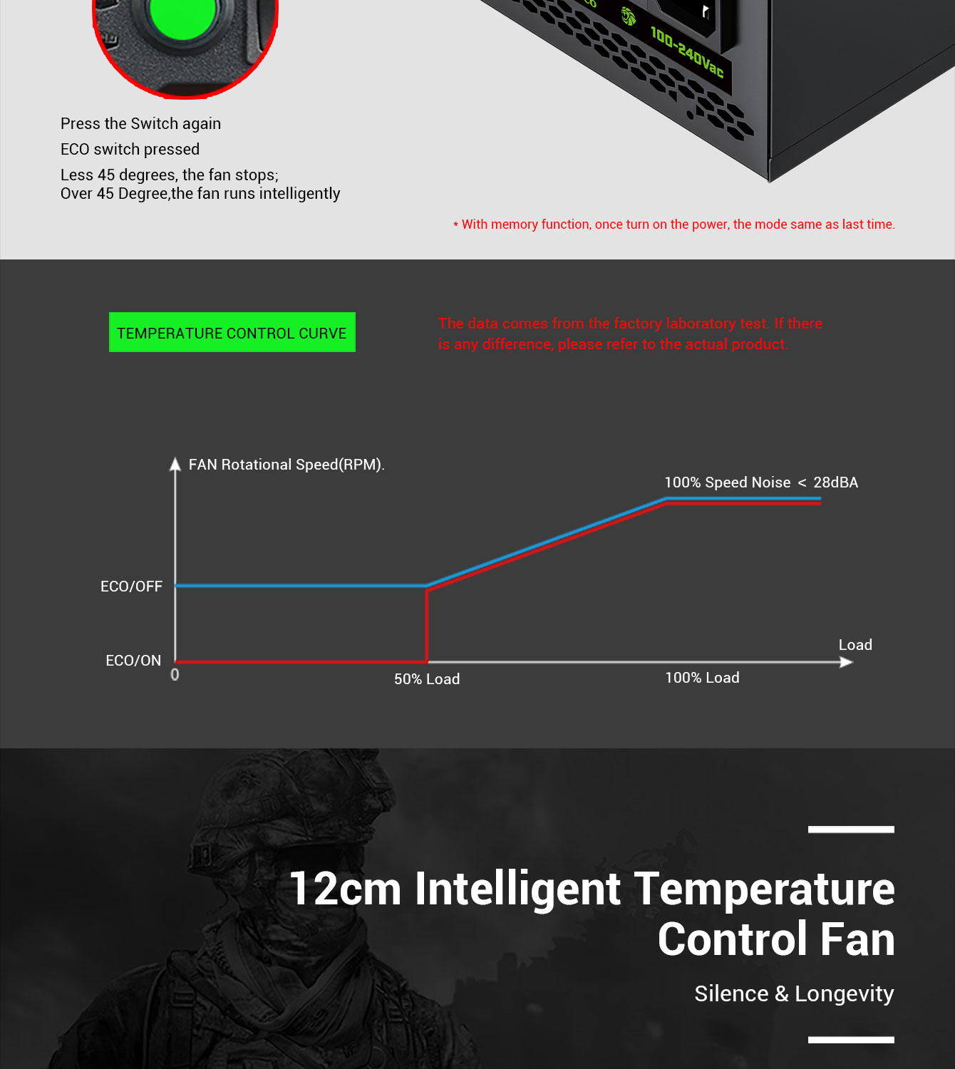 • The ECO switch allows users to customize their cooling needs by selecting between the Fanless Mode and the Silent Mode.