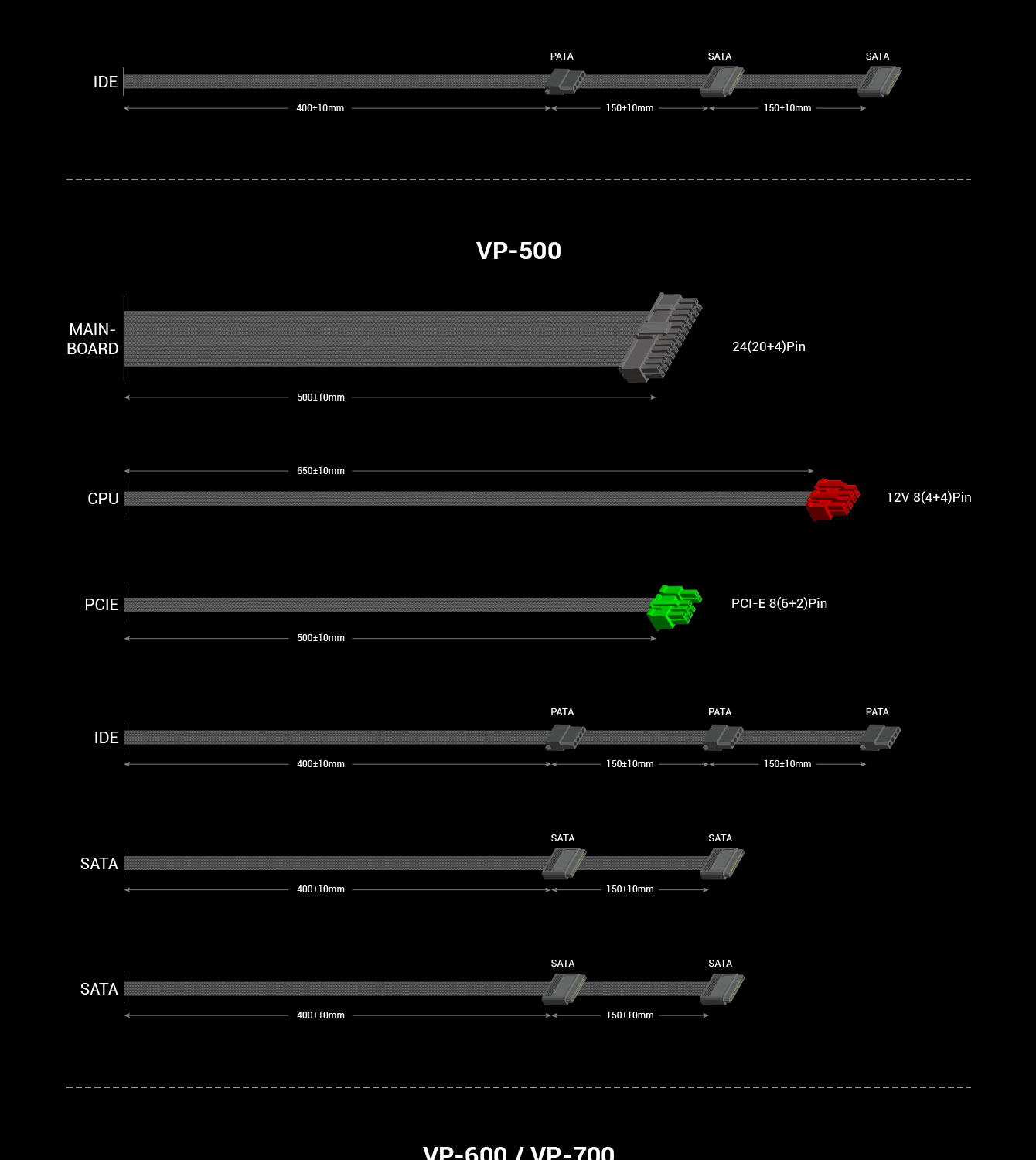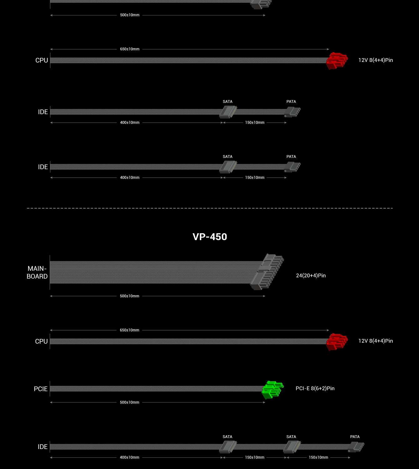 | Cable type | Black tube shield along with colors CPU and PCIe connecor | |