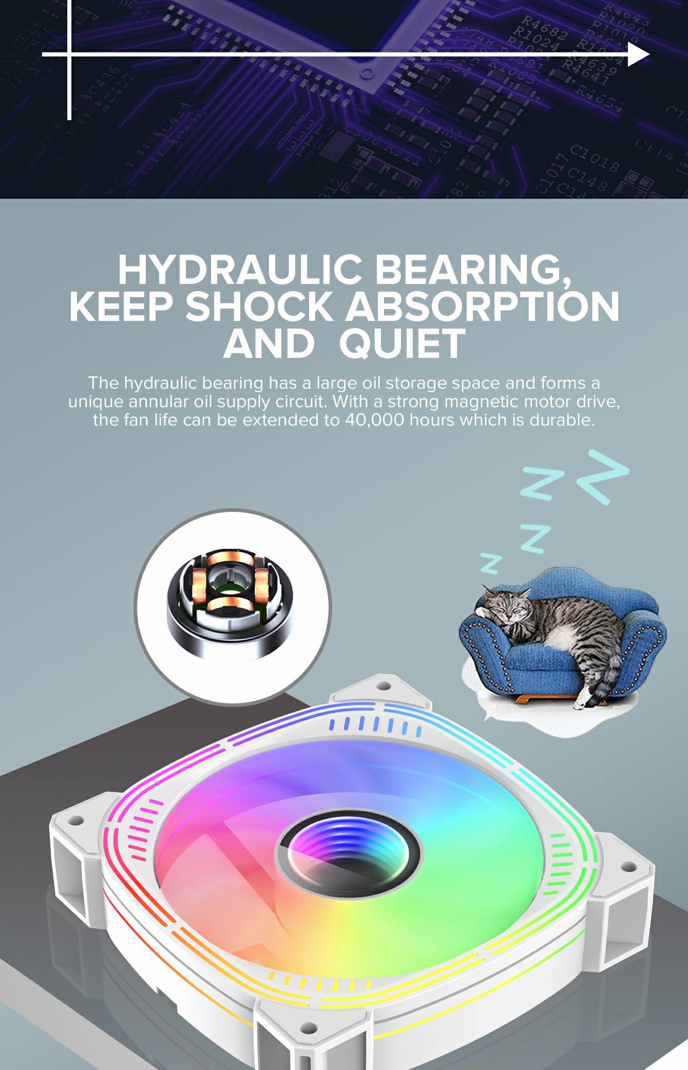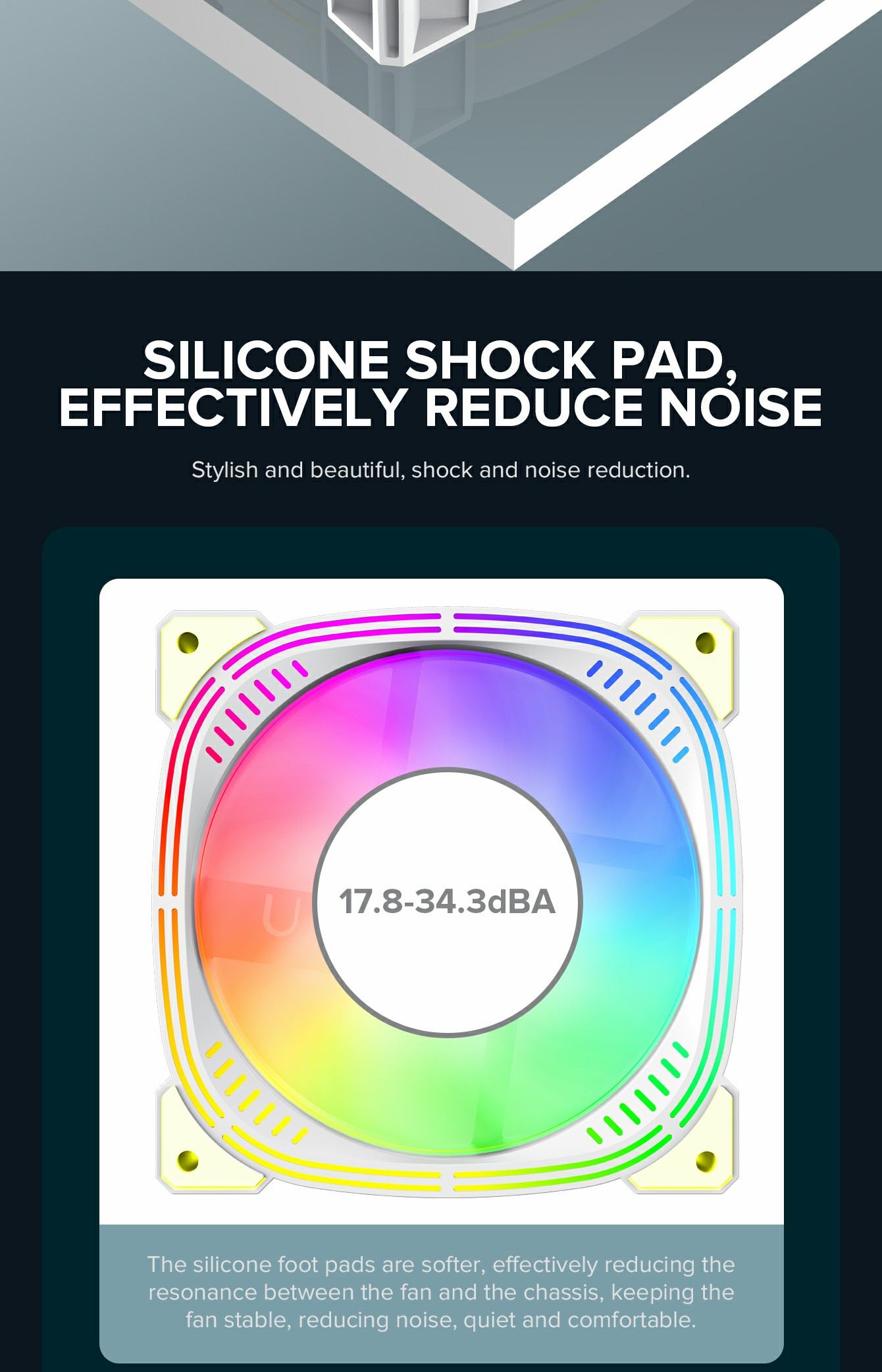 Anti-noise design by optimized fan blade and there are rubber gaskets on the fan corner.