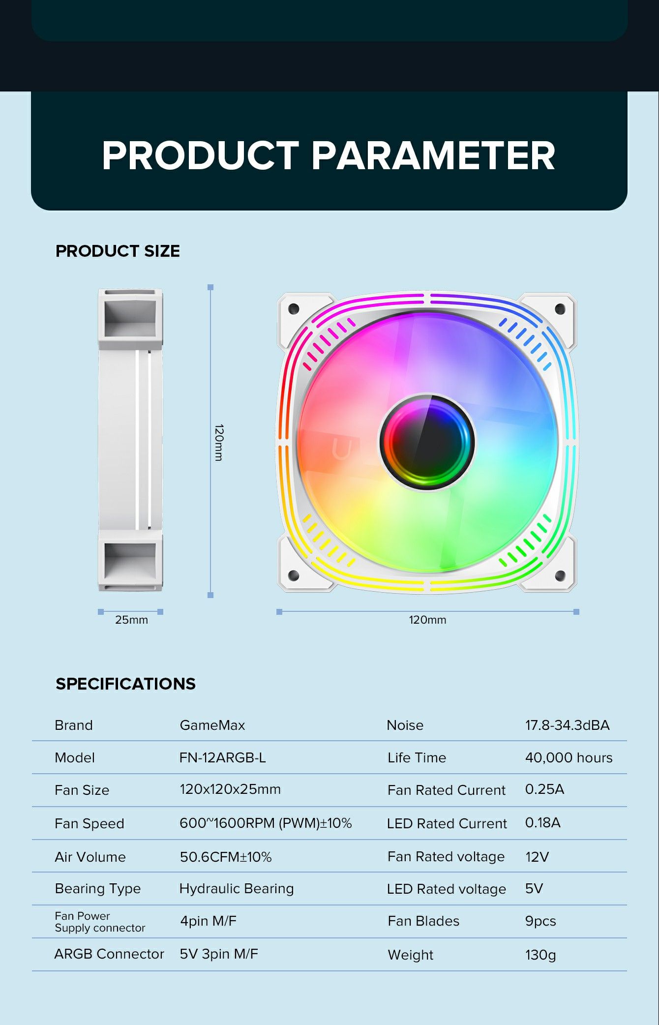 | Rated Voltage | DC12V(FAN)/DC5V(LED) |