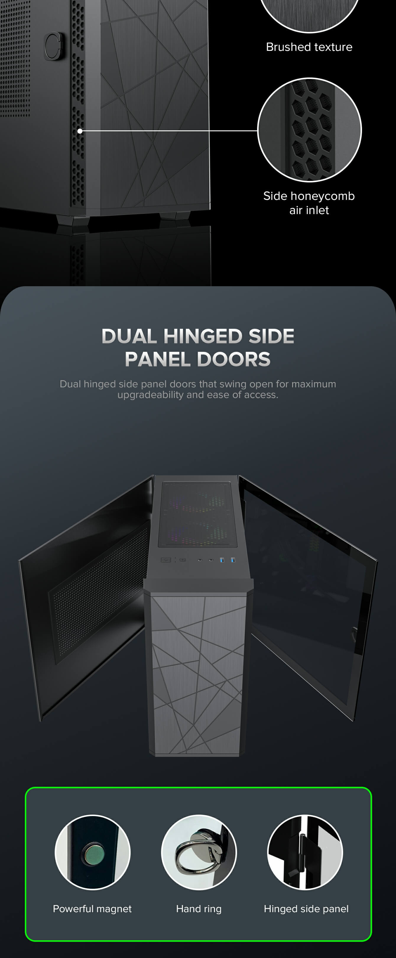 • Both side panels swing open like doors giving you quick access to swap components effortlessly