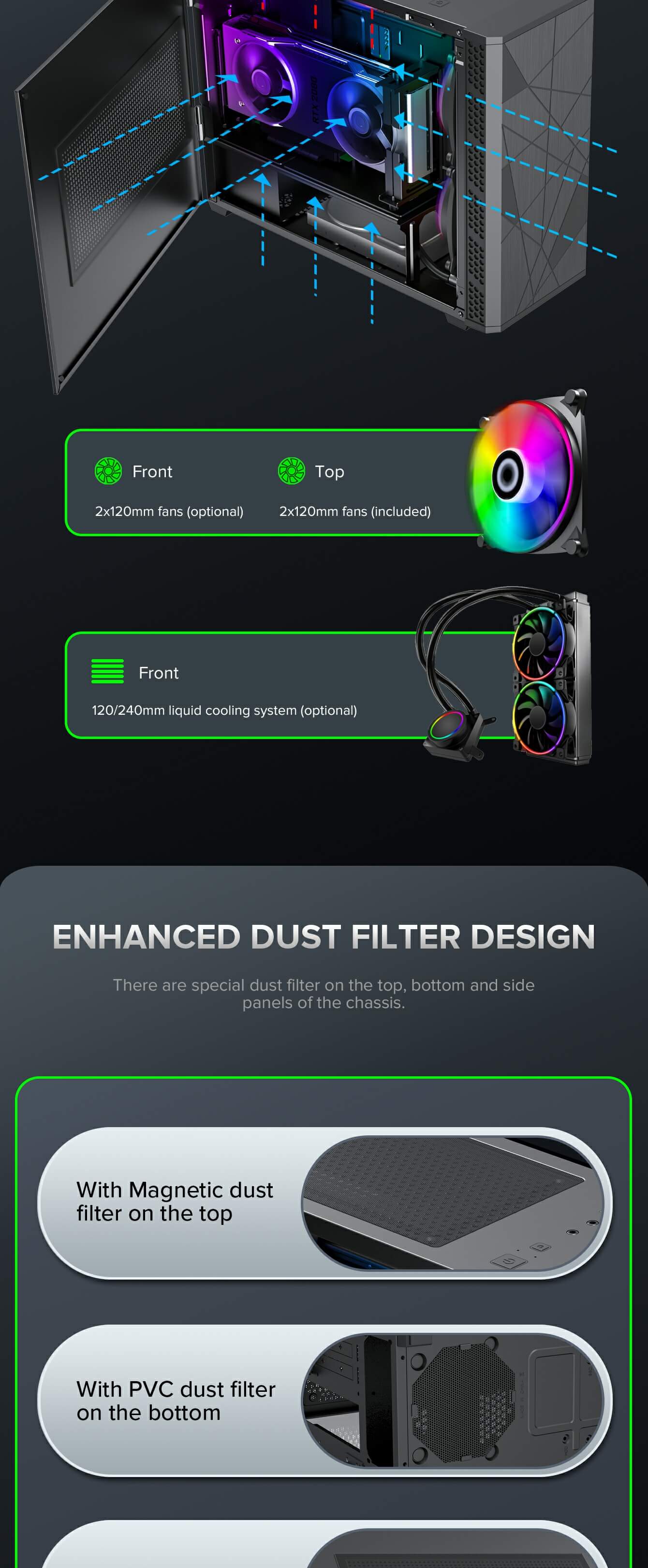 | Cooling Fan Support | Front | 2x120mm (Optional) |
