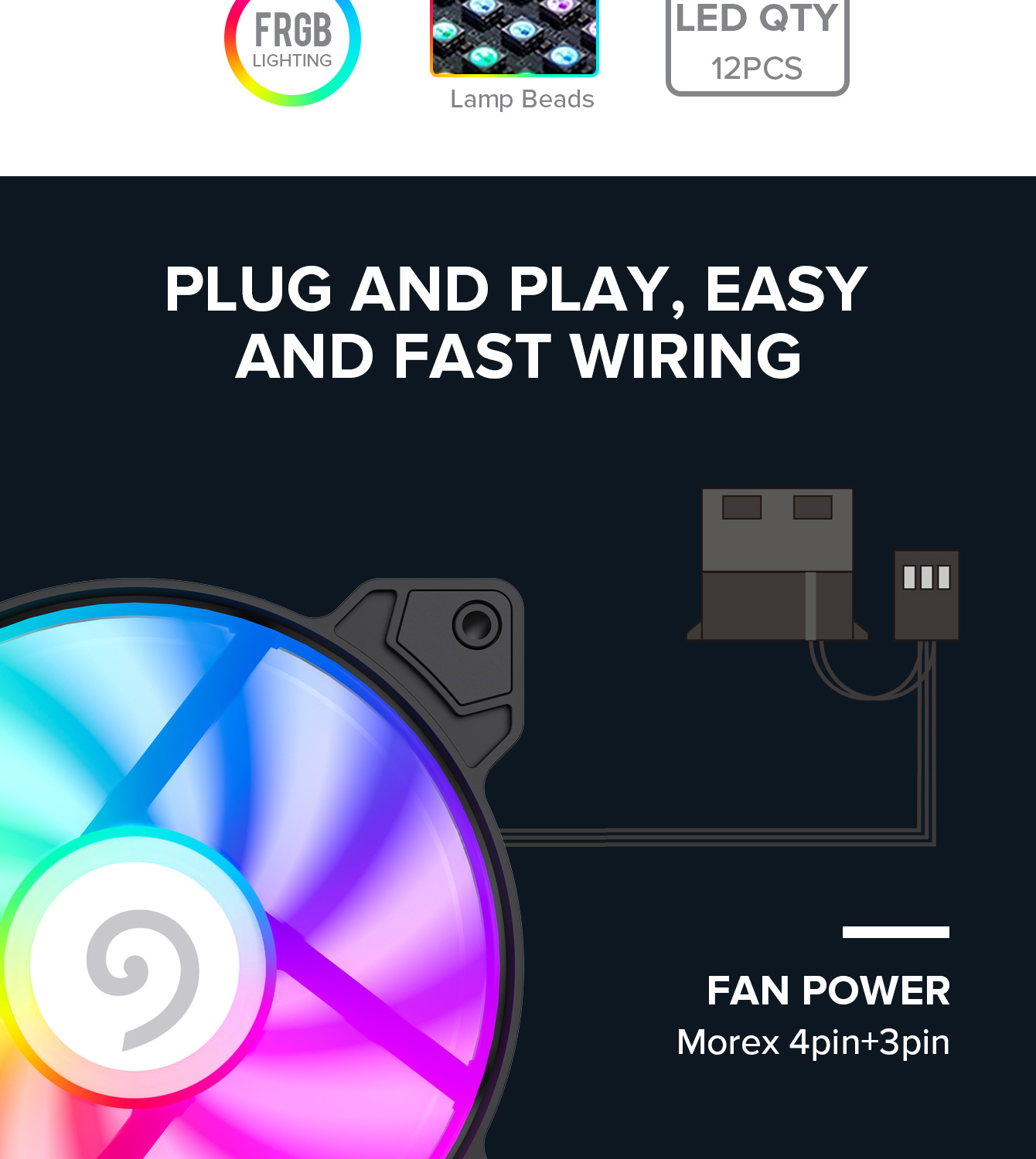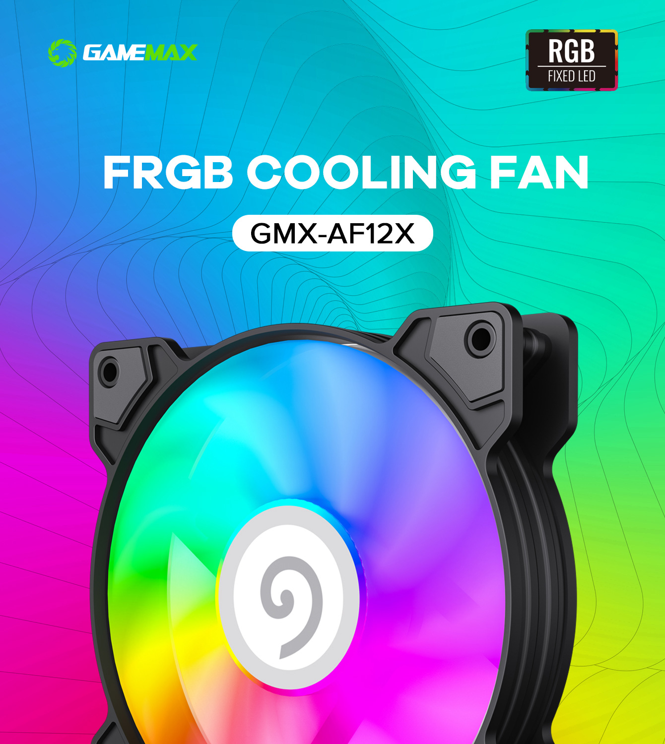 Gamemax GMX-AF12X 120mm FRGB PC Cooling FAN, 120mm fan with Molex + 3-Pin connector, featuring a stylish Fixed RGB LED Lighting design to add an extra flair to your rig