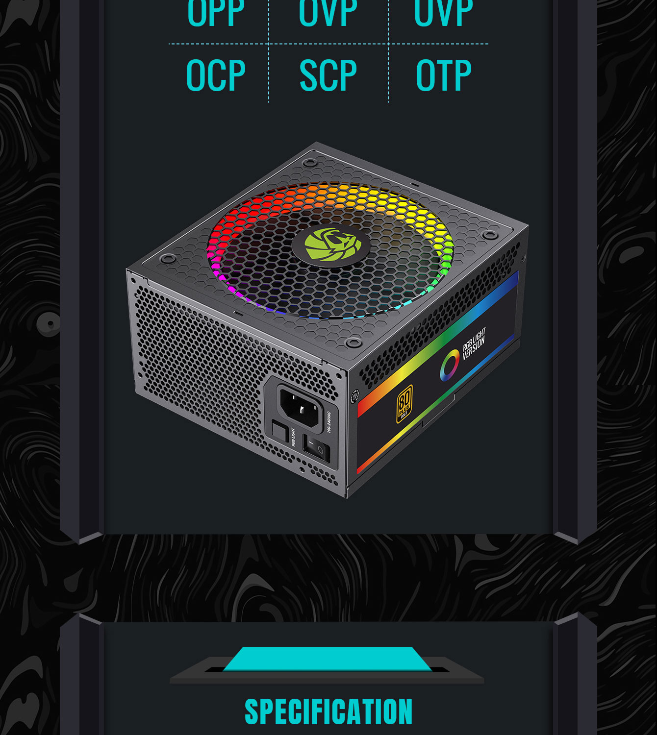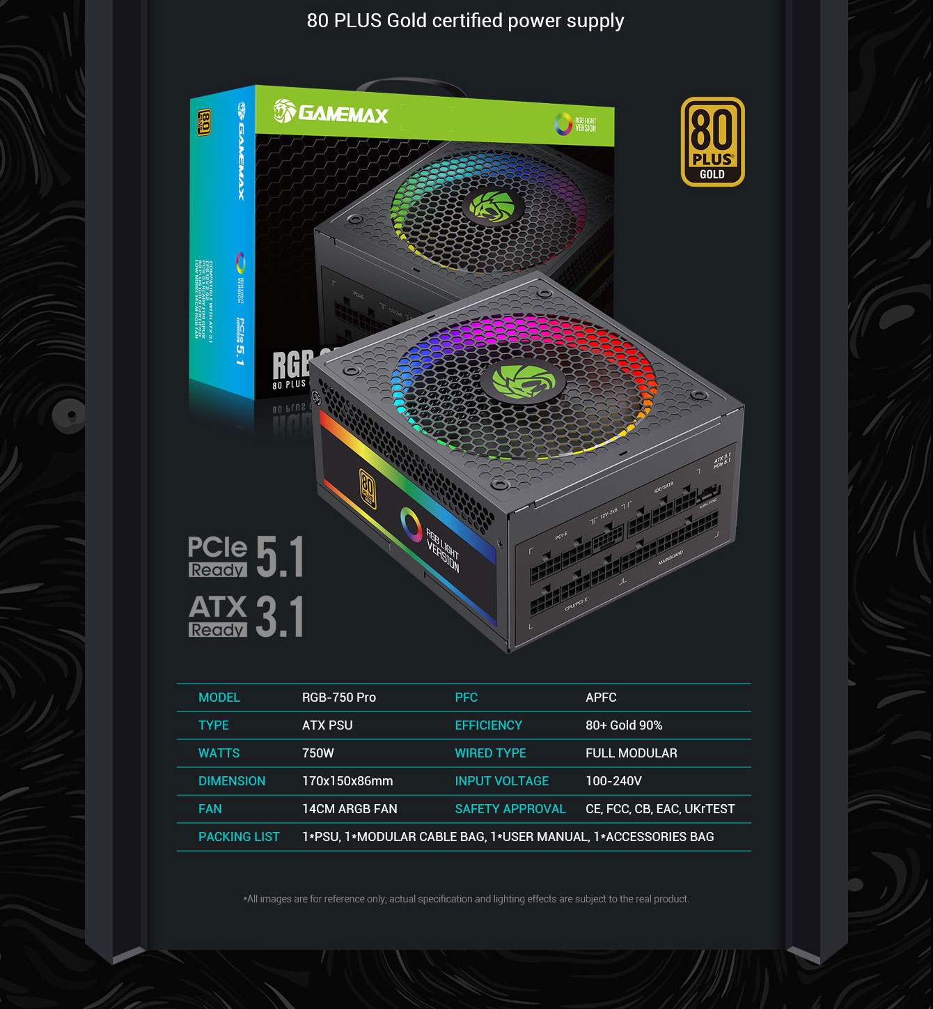 Power Supply RGB-750 PRO Fully Modular 80+ Gold Certified with RGB Light Mode ARGB SYNC.