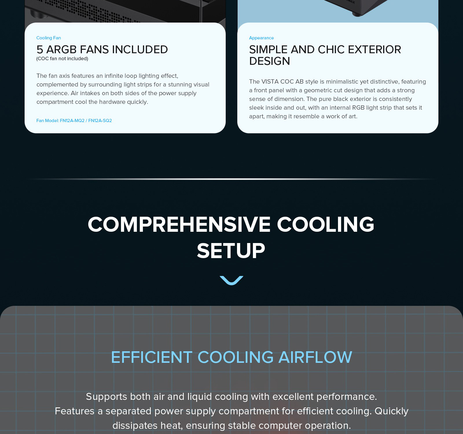 Корпус для игрового ПК Vista COC AB ATX Mid-Tower оснащён панорамным видом 262°, запатентованным охлаждением COC, 5 ARGB вентиляторами и стильным дизайном с модульной компоновкой для гибкой сборки.