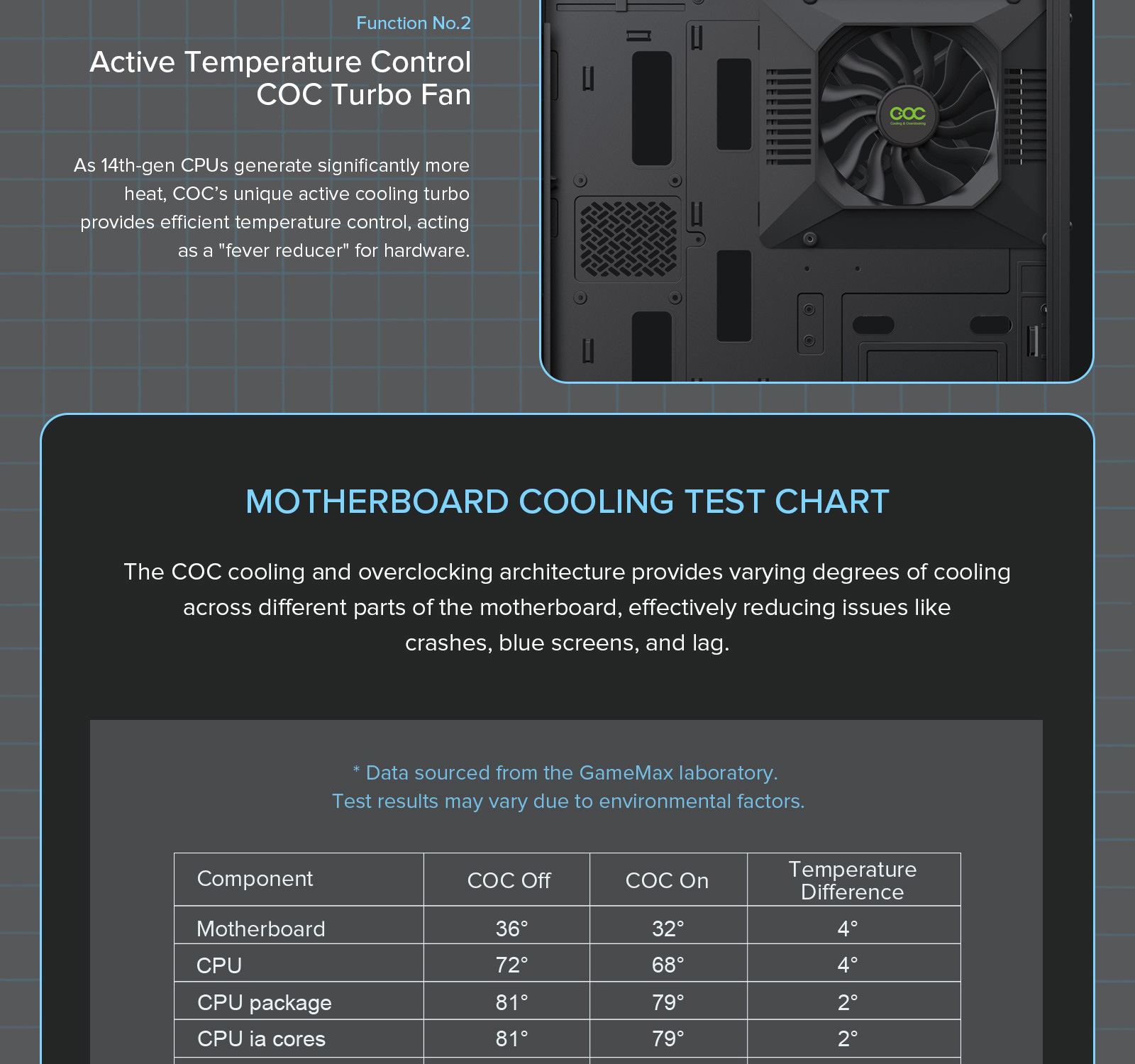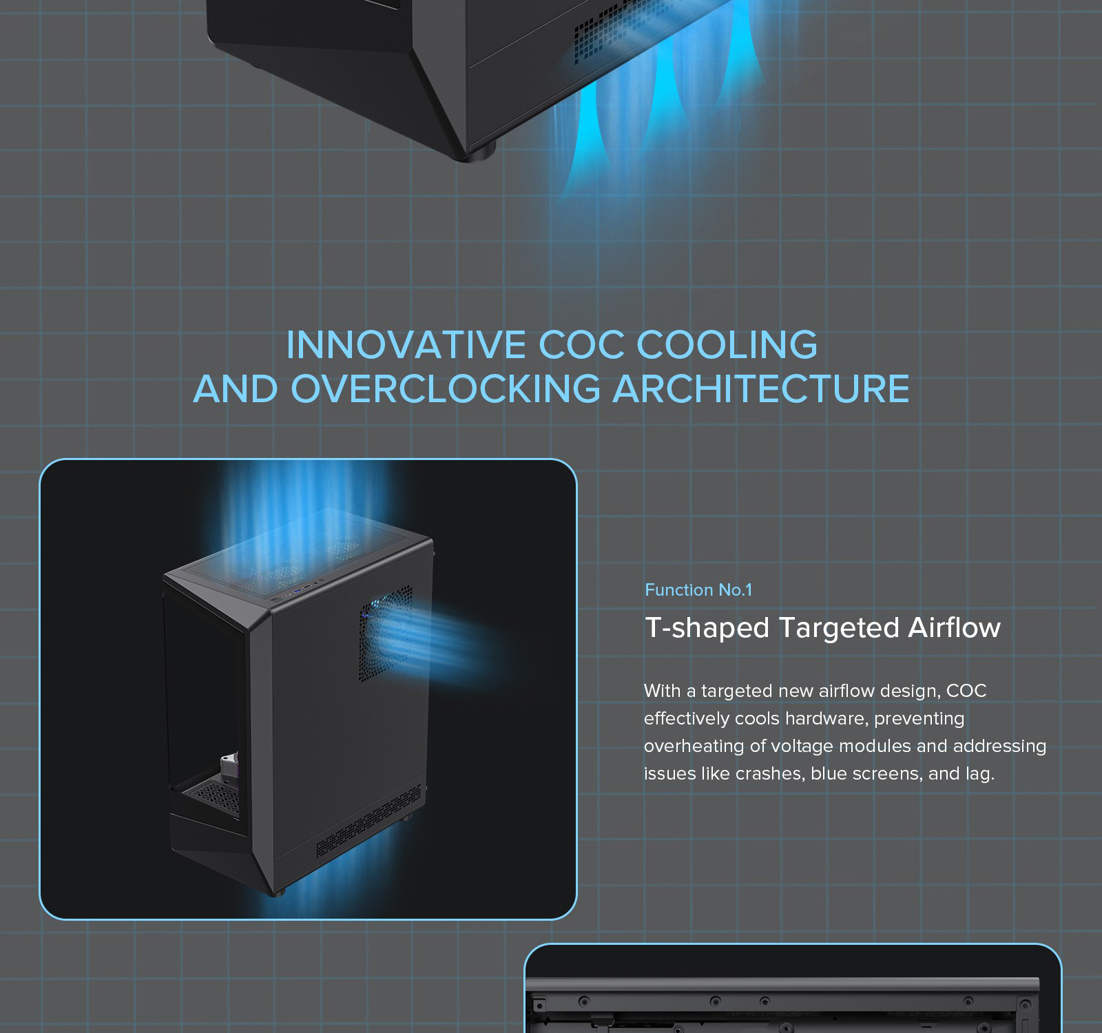• Запатентованное охлаждение COC: 12-см вентилятор с контролем температуры обеспечивает стабильность во время интенсивных игр и разгона.