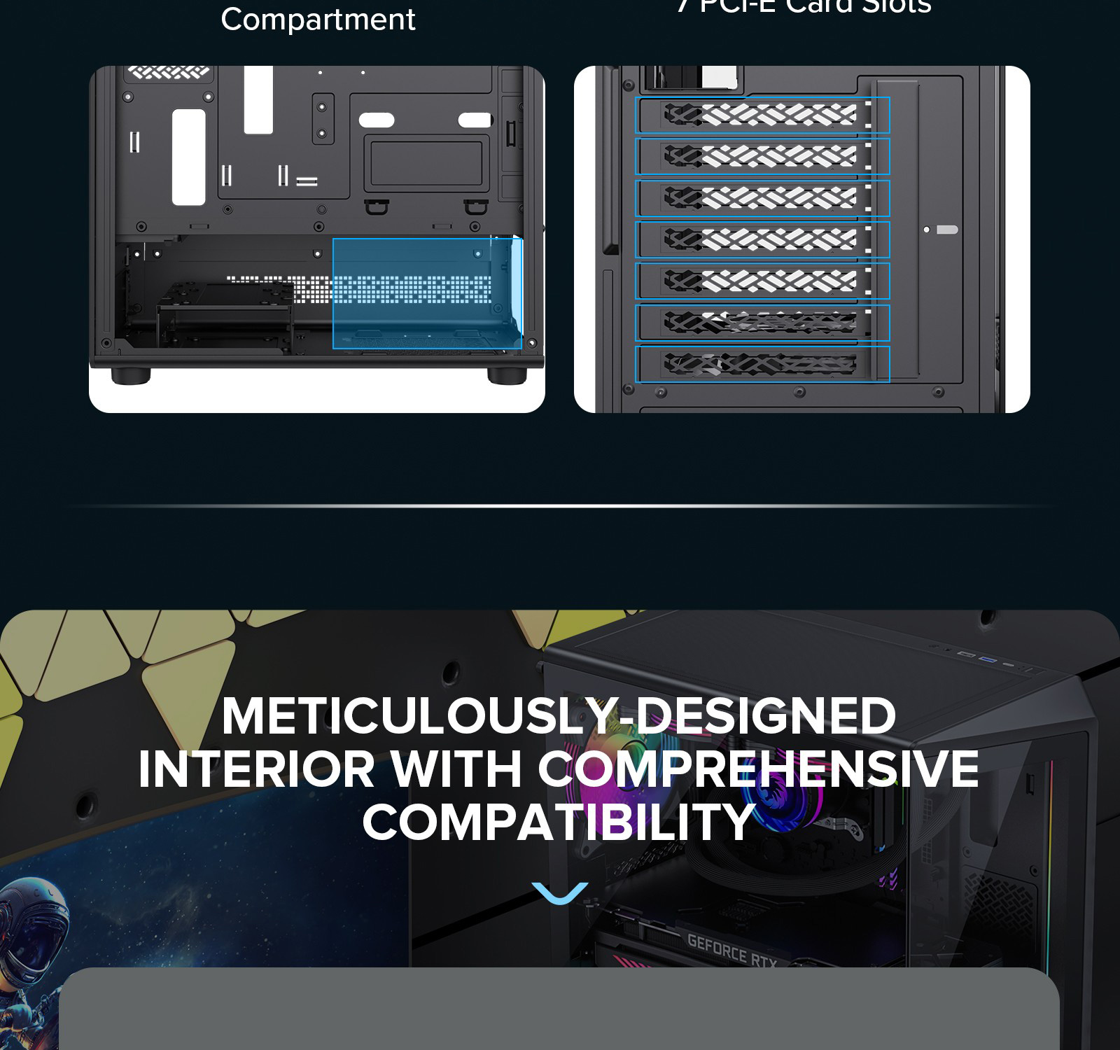 • 262° Панорамный вид: Панели из закалённого стекла с высокой прозрачностью позволяют увидеть компоненты с разных углов.
