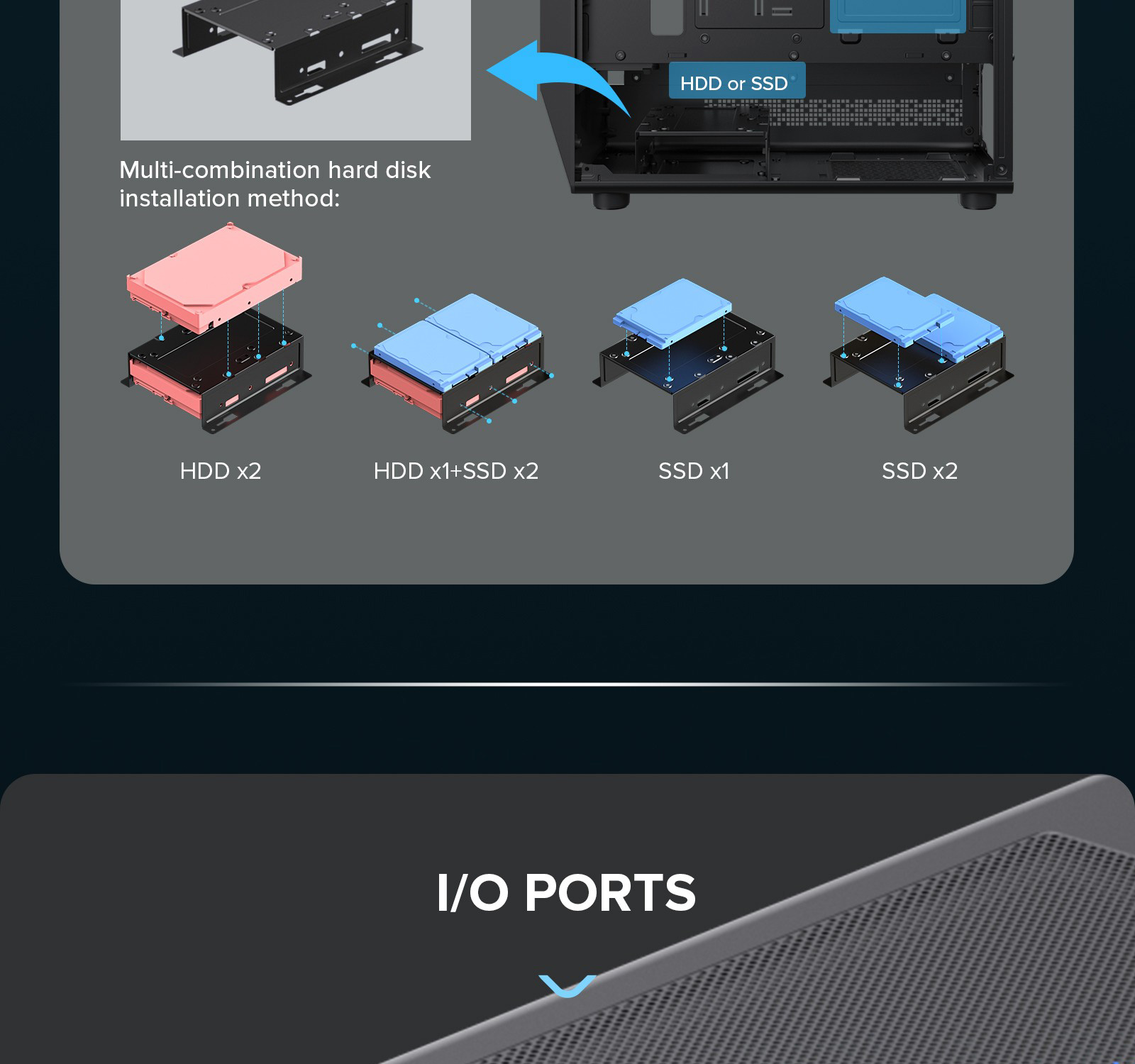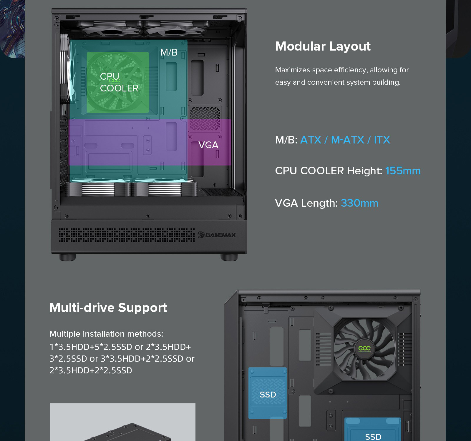 • Модульная компоновка: Поддержка материнских плат ATX/M-ATX/ITX, процессорных кулеров до 155 мм, видеокарт до 330 мм и универсальных конфигураций HDD/SSD.