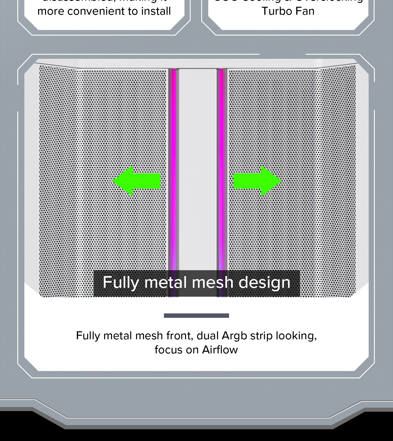 • The all-metal mesh front panel is designed in one piece, and the dust-proof hole design is fully covered, focusing on the cooling airflow
