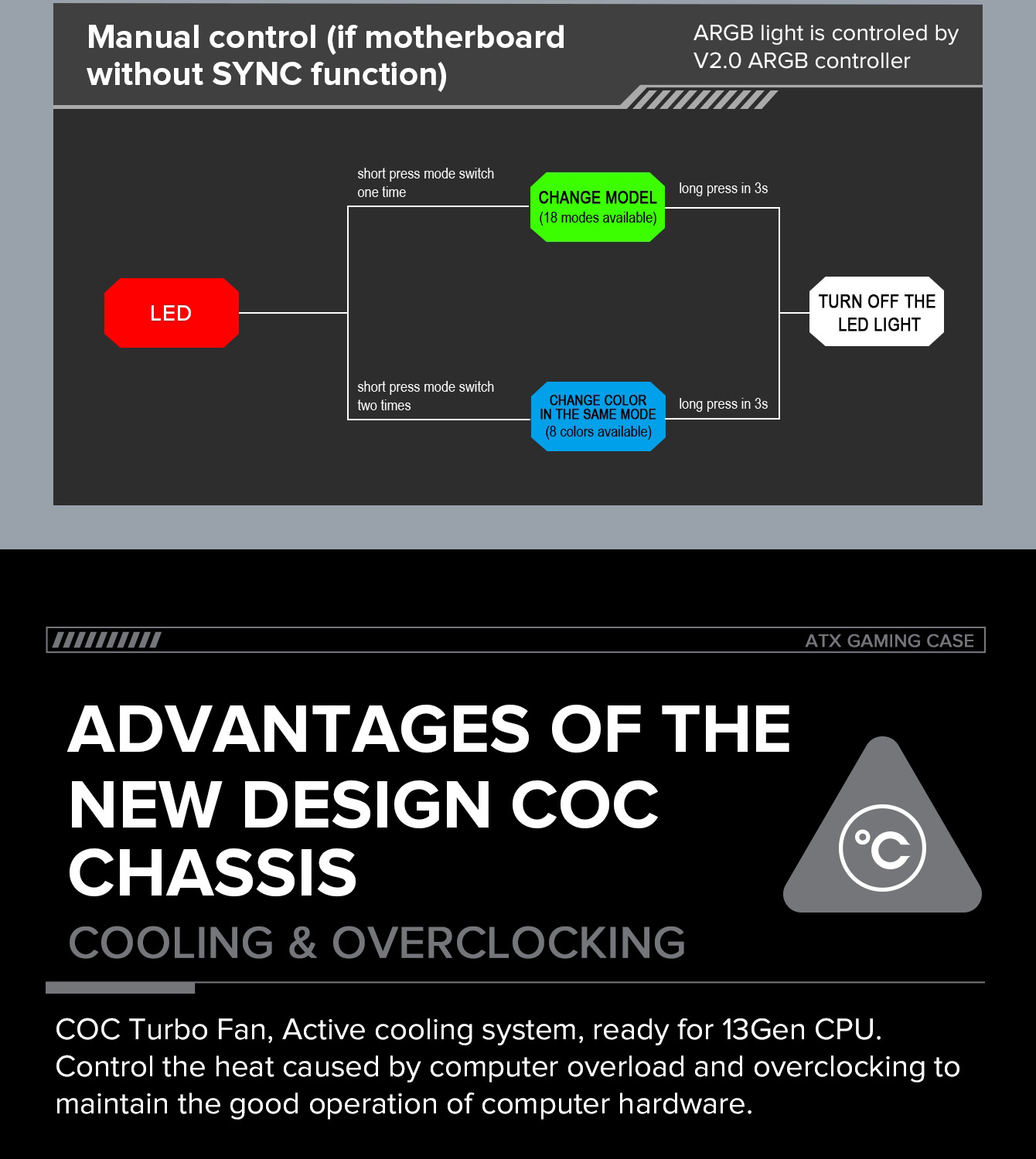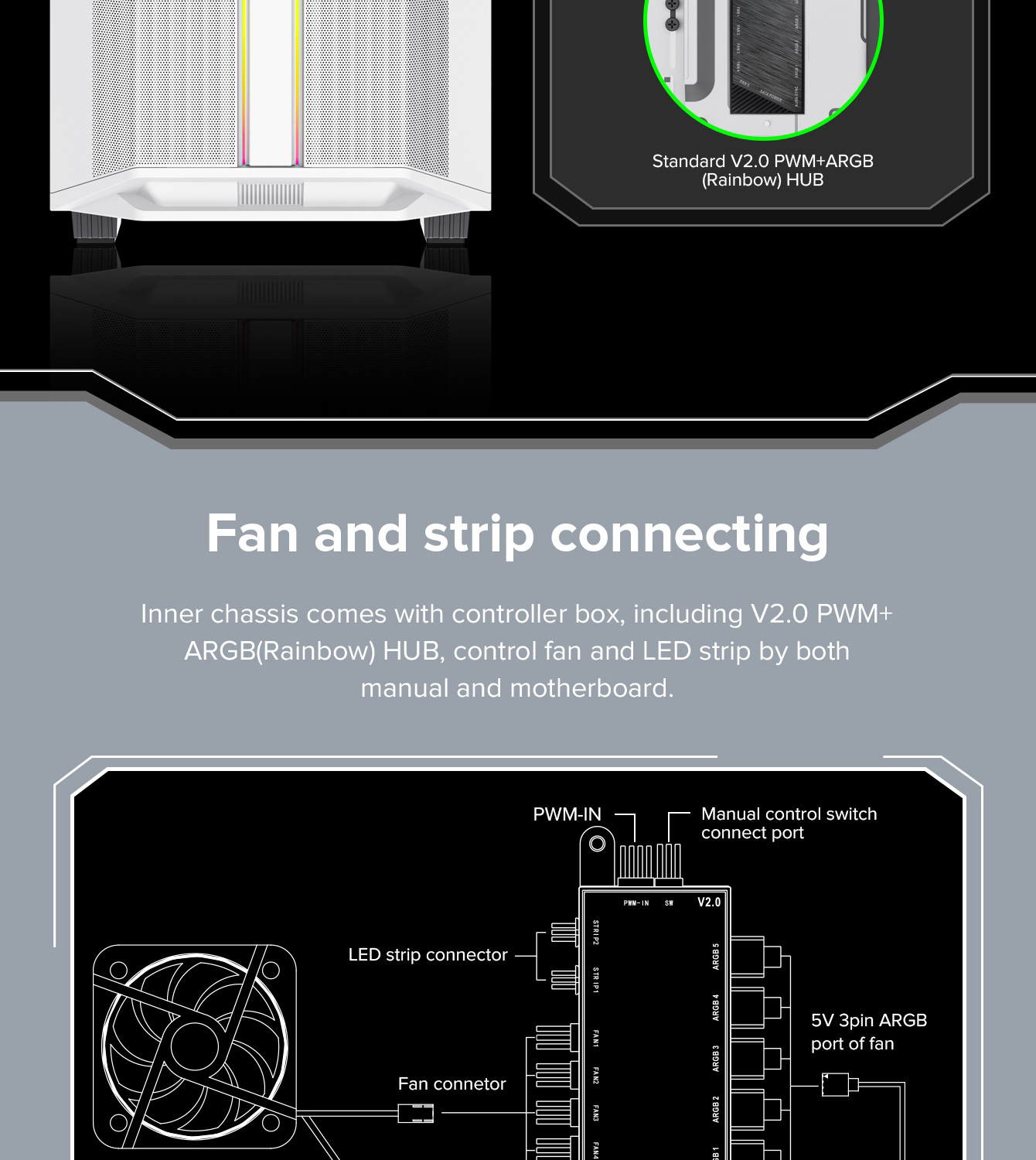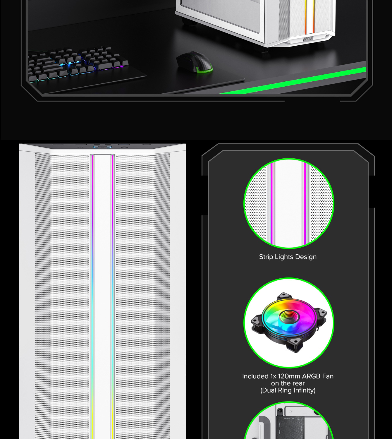 • Dual ARGB light bar appearance, with ARGB HUB or motherboard ARUA synchronous interface control, provides a variety of colors and modes to personalize the appearance