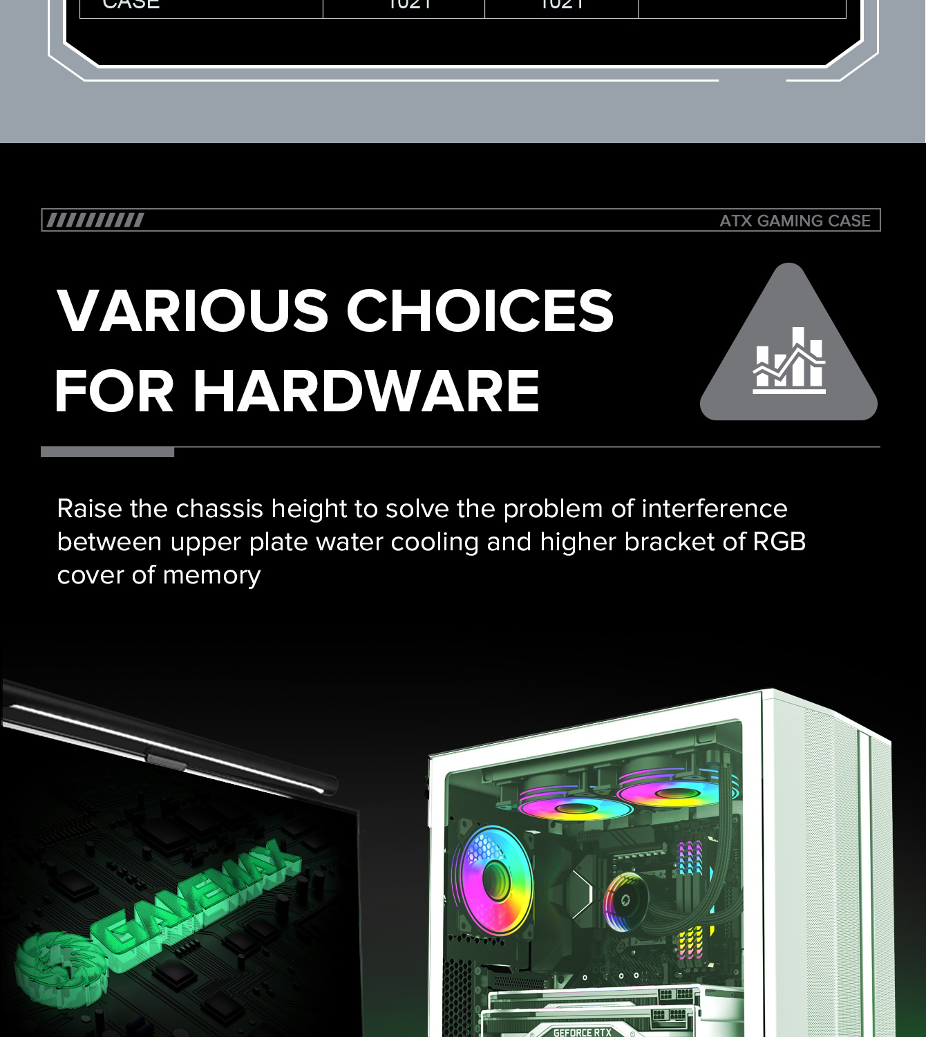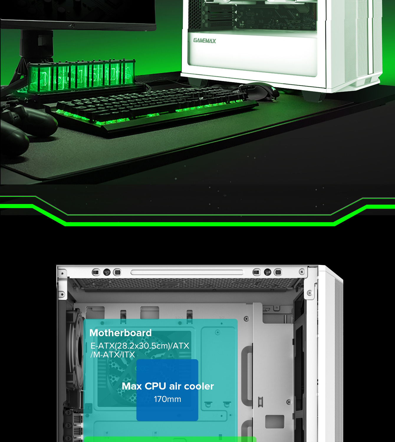 • Upgrade the top plate, increase the height of the chassis, and solve the problem of mutual interference between the water cooling of the upper plate and the high bracket of the memory RGB cover