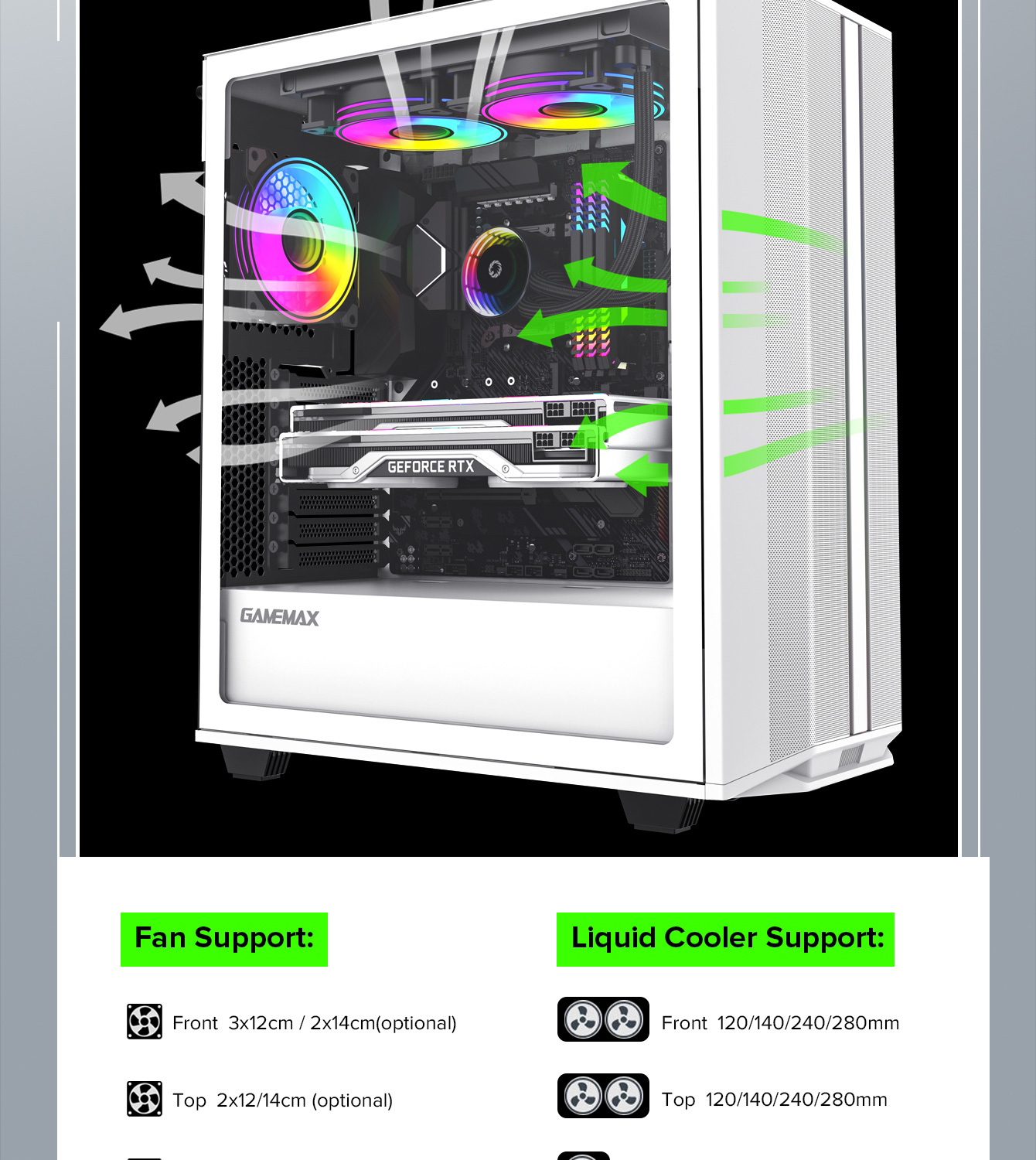 | Water Cooling Support (Radiator Size) | Front | 120mm*1, 140mm*1,240mm*1,280mm*1 |