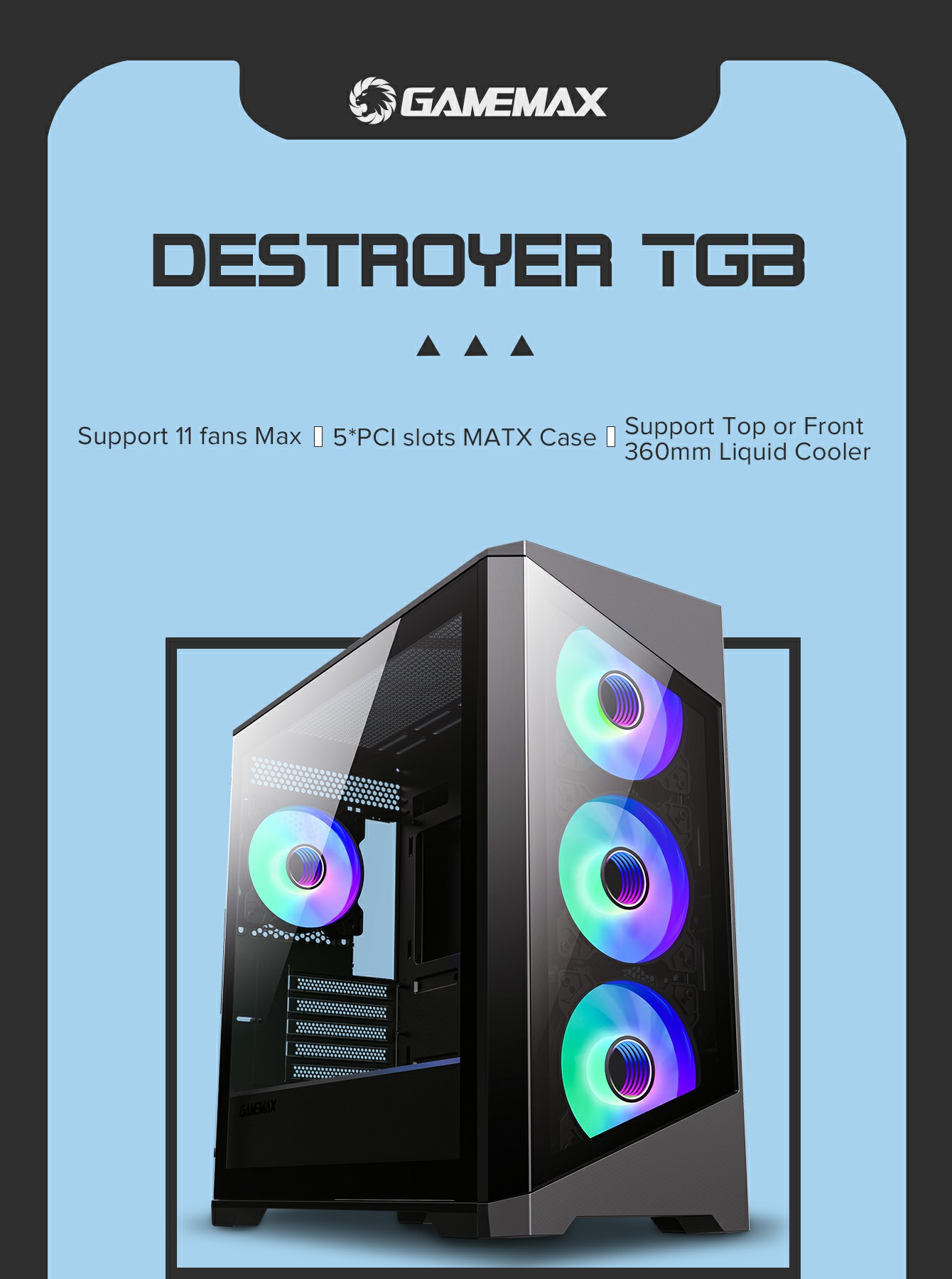 GameMax Destroyer TG Micro-ATX Gaming Case with 4 ARGB Fans, Tempered Glass Panels, 360mm Radiator Support on Top, and Extreme Cooling Performance