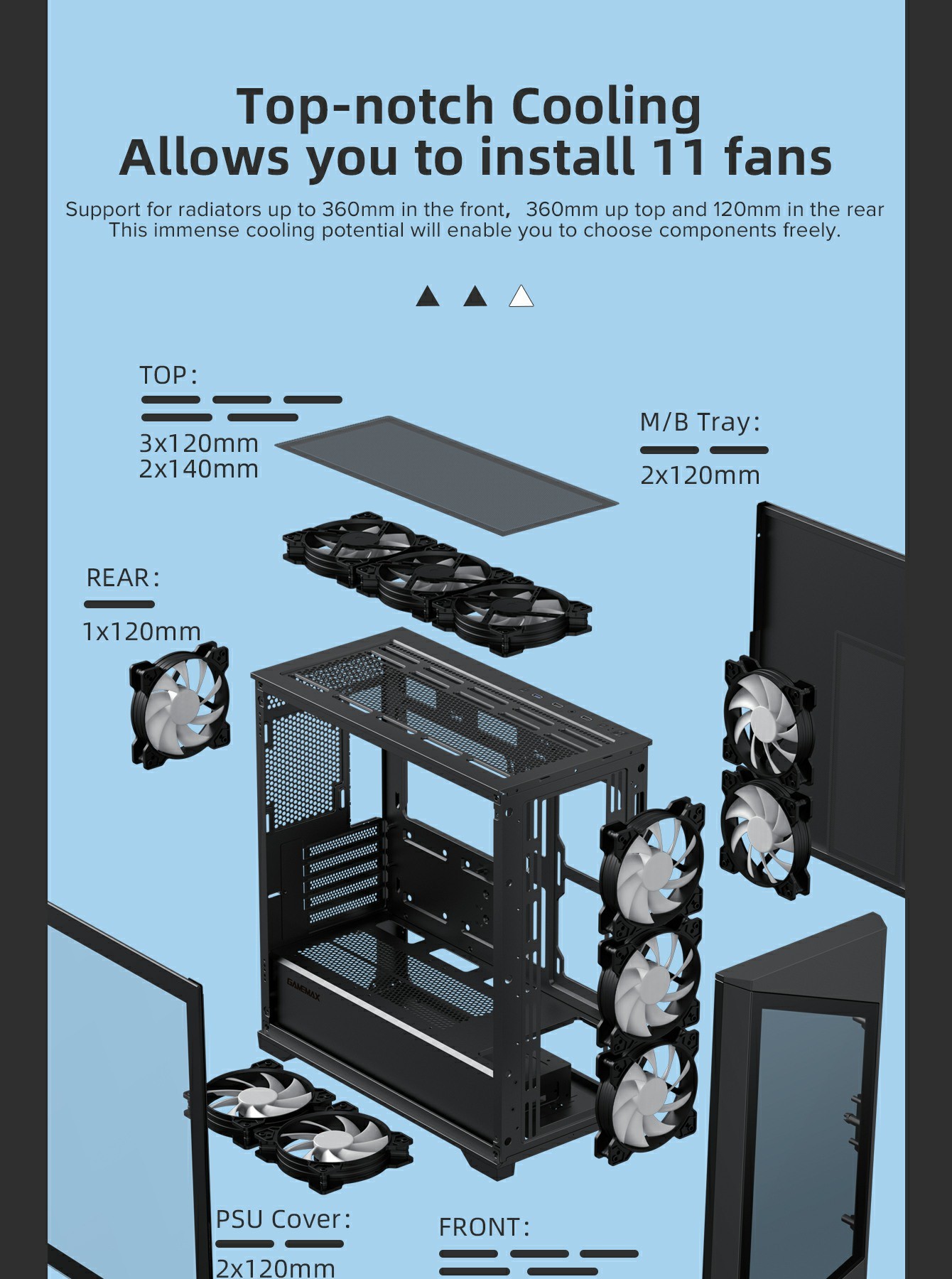 | Top | 3x120mm ,2x140mm (Fan optional) | |