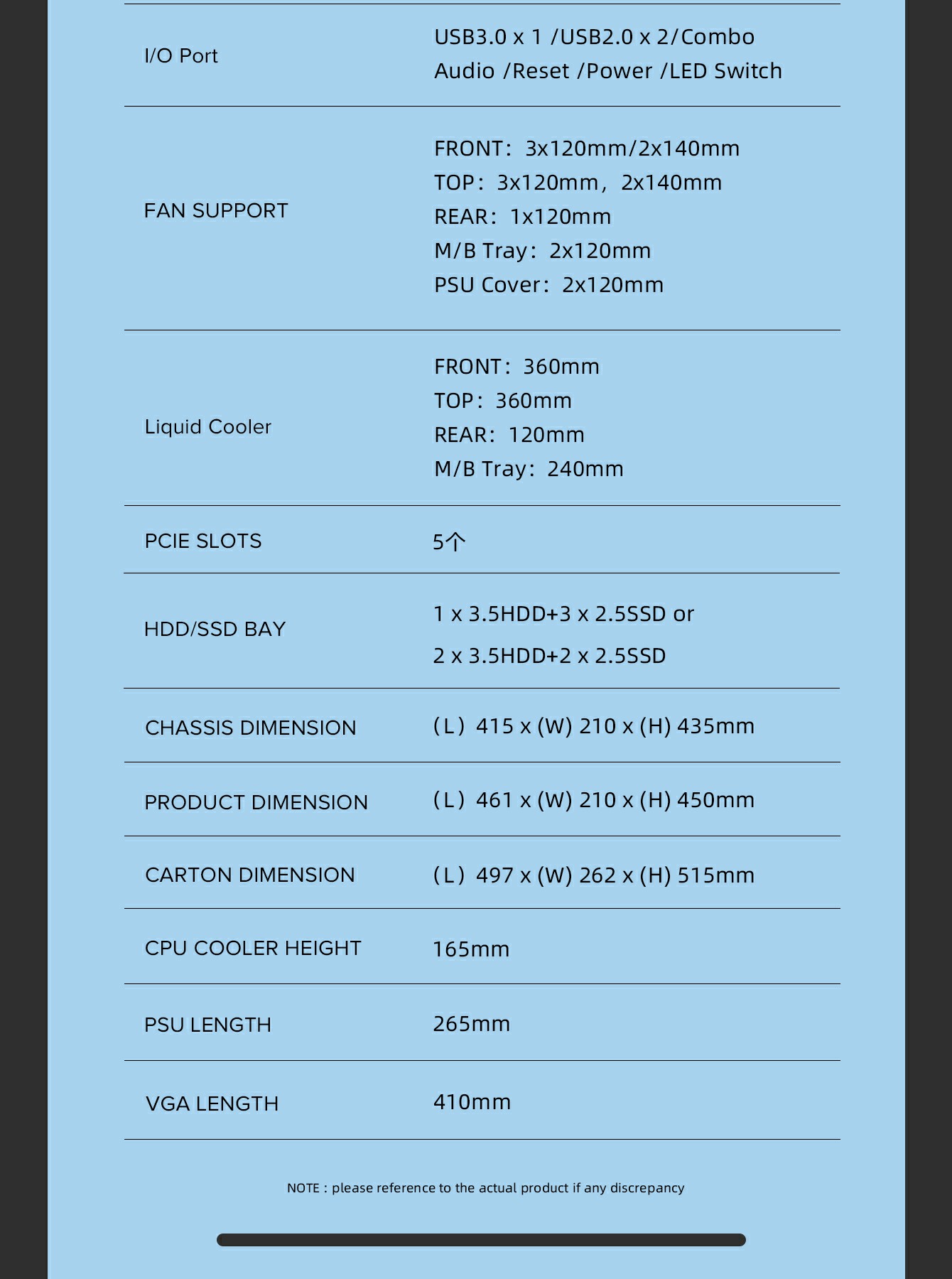 | Dimensions | Chassis | (L)415*(W)210*(H)435mm |