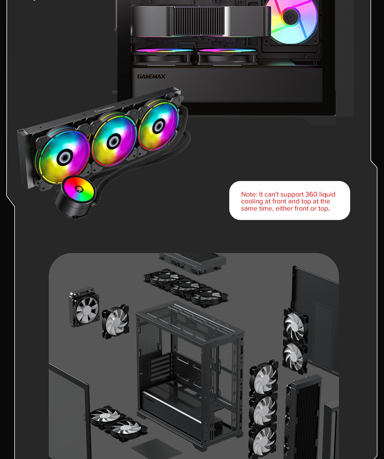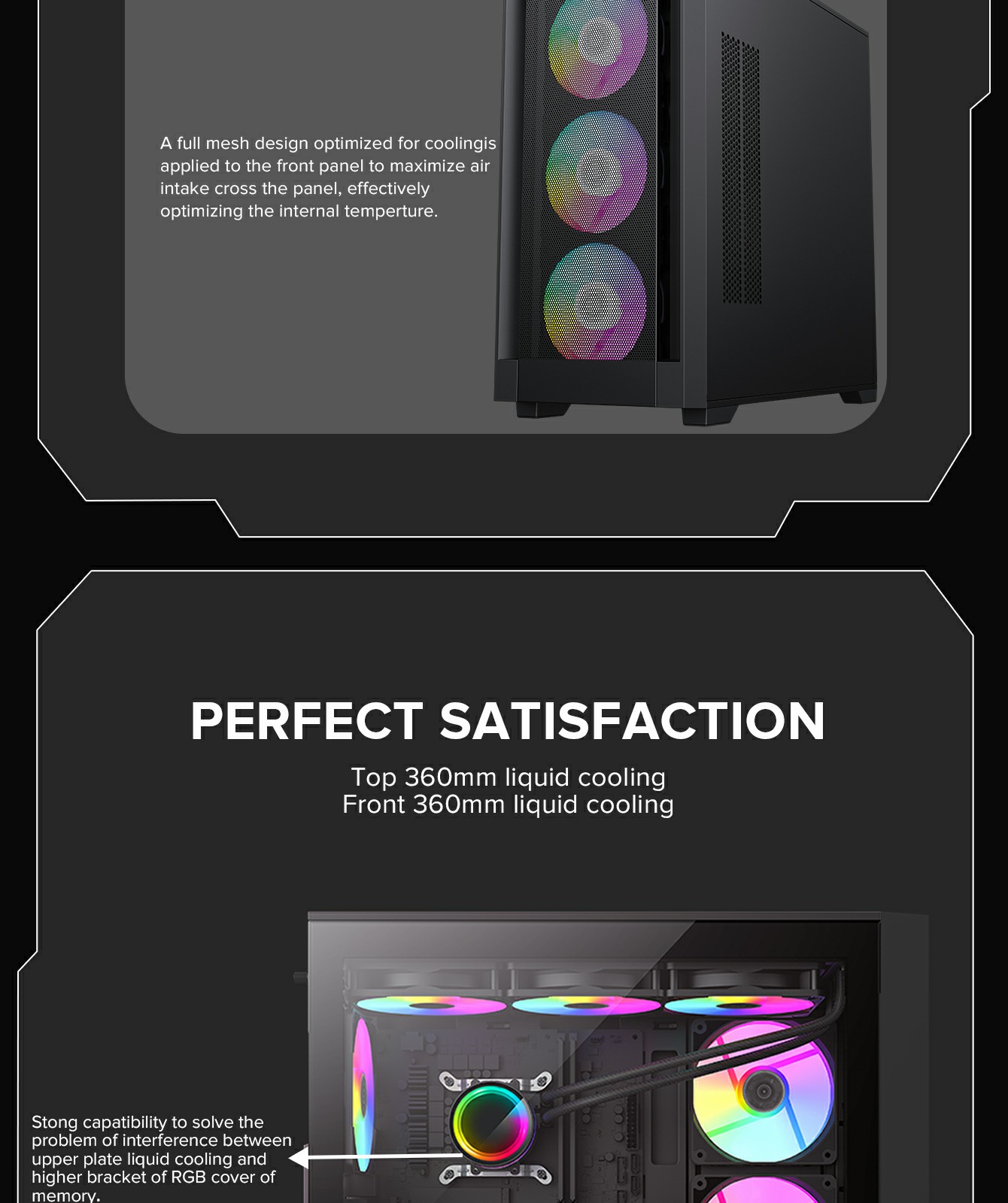 • with 1 x Tempered Glass Panel, Top support 360 liquid CPU cooler, Pre-installed 4x ARGB Fans, and fully metal mesh on the front panel for maximum airflow