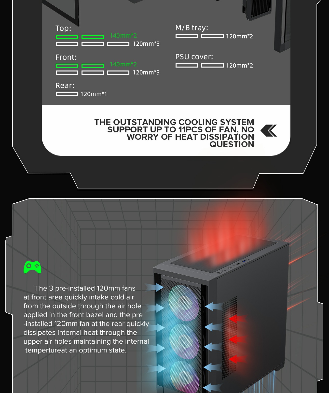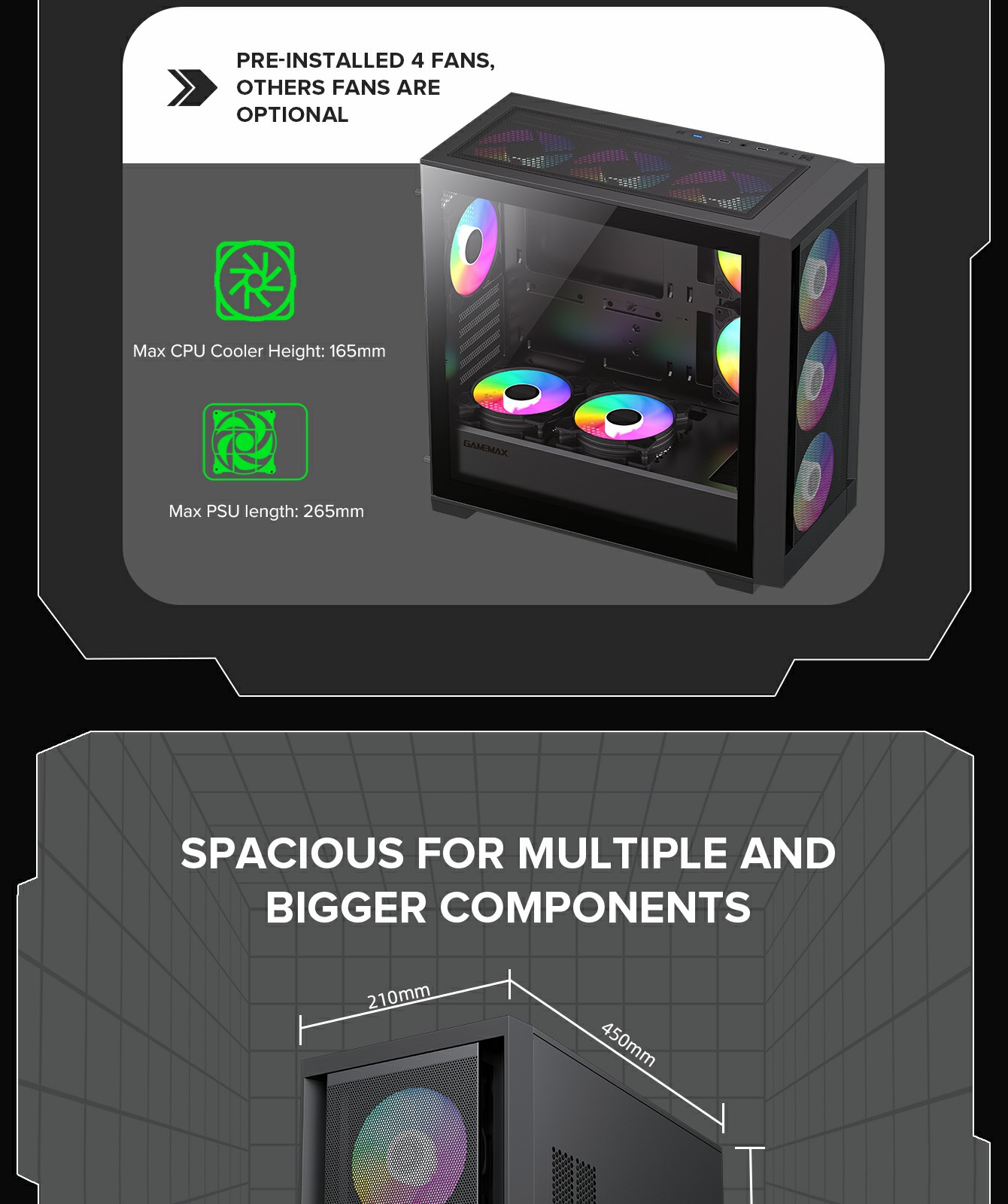 • Extreme Cooling Performance: With 4x 120mm ARGB fans in the front 3x120mm ARGB fan at the rear 1x120mm ARGB Fan,keeps temps in control even during high loads