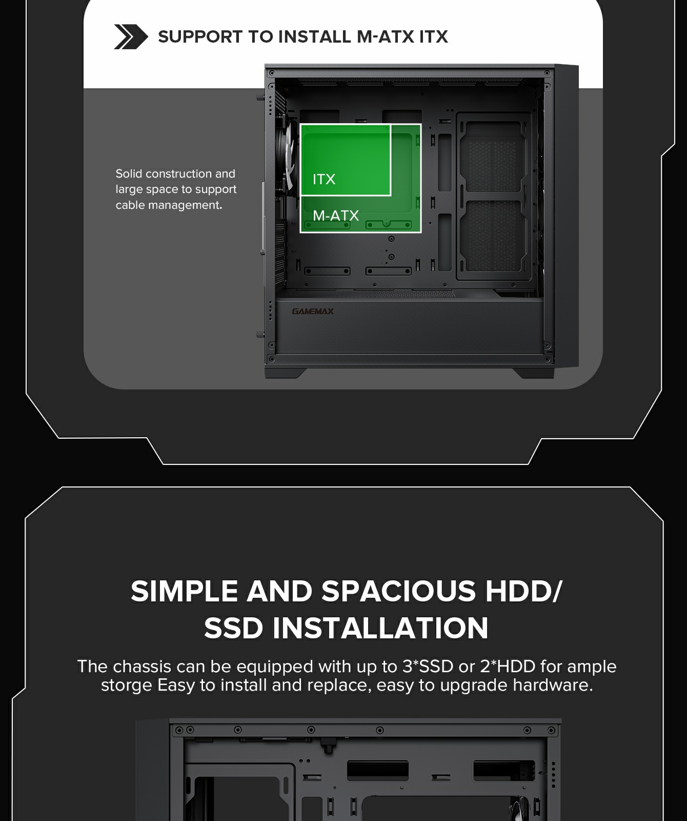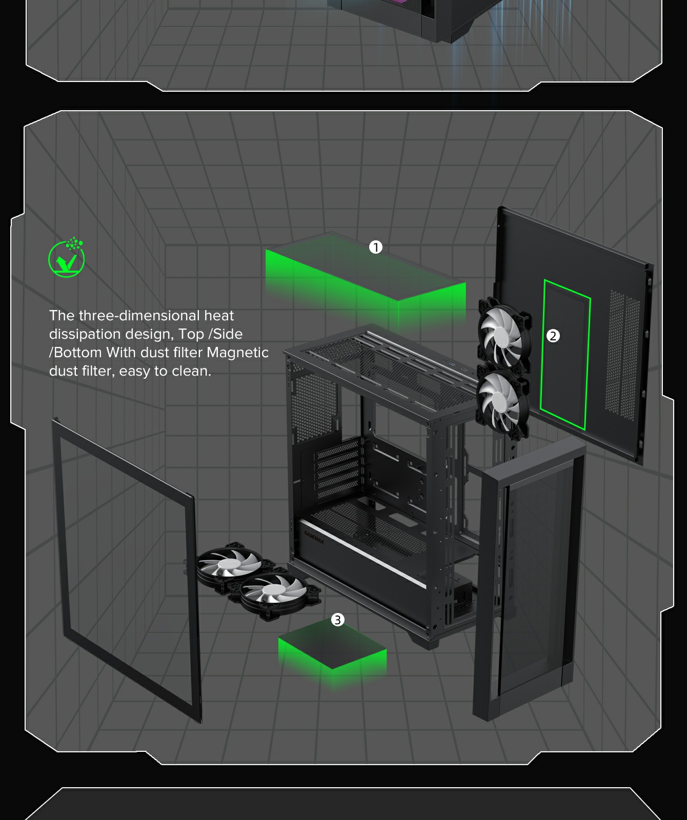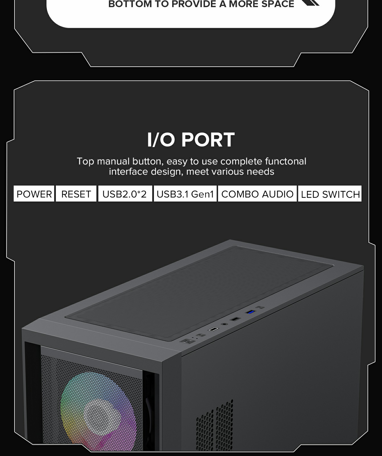 • Compelling Front Panel: The front panel balances functionality and aesthetics This mesh consists of 1.0mm diameter mesh holes spaced at 2.0mm apart, providing a 48.3% open area ratio that allows greater airflow to pass through and efficiently prevents dust from entering the PC.5xPCIe Slot position, born for thicker RTX-40xx series GPU card, leaves additional space to increase cooling of the video card, improve performance and stability