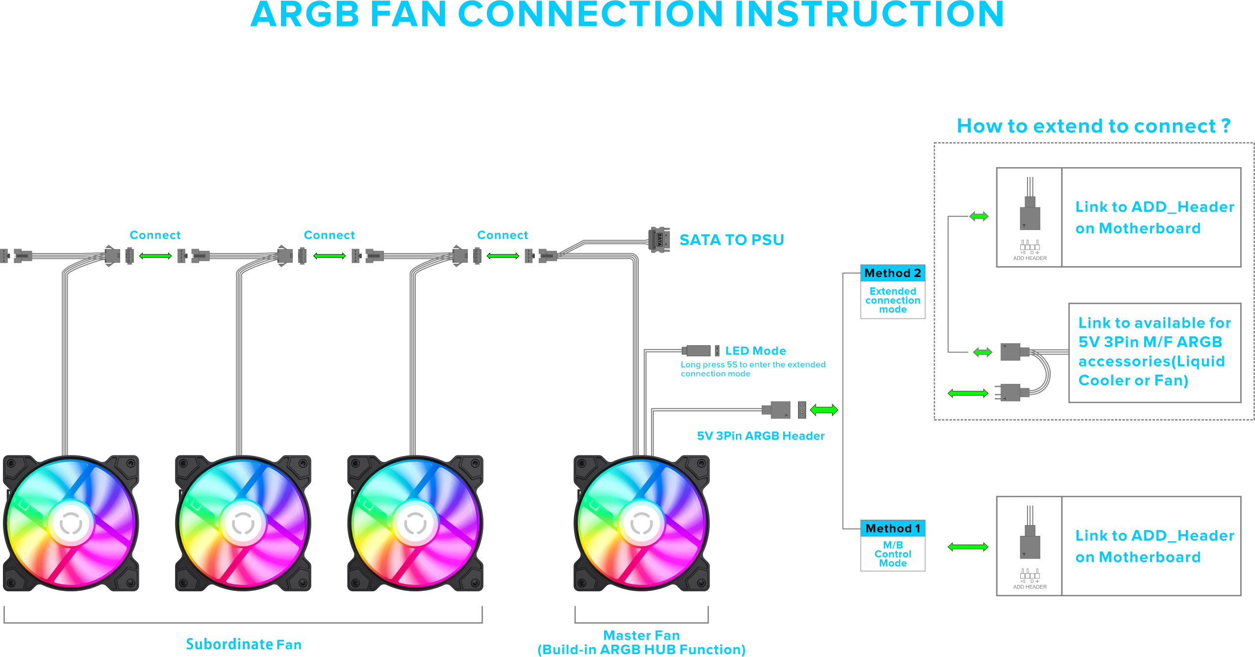 2) how to extension fans? 5V3pin ARGB header link addtional 3pin male of fan and Femal fan link to Motherboard Addressable ARGB port on motherboard, (under extension mode, it is avaliable for Aura SYNC only, ie, RGB light mode via softerware controlled, and build-in manual mode disable)