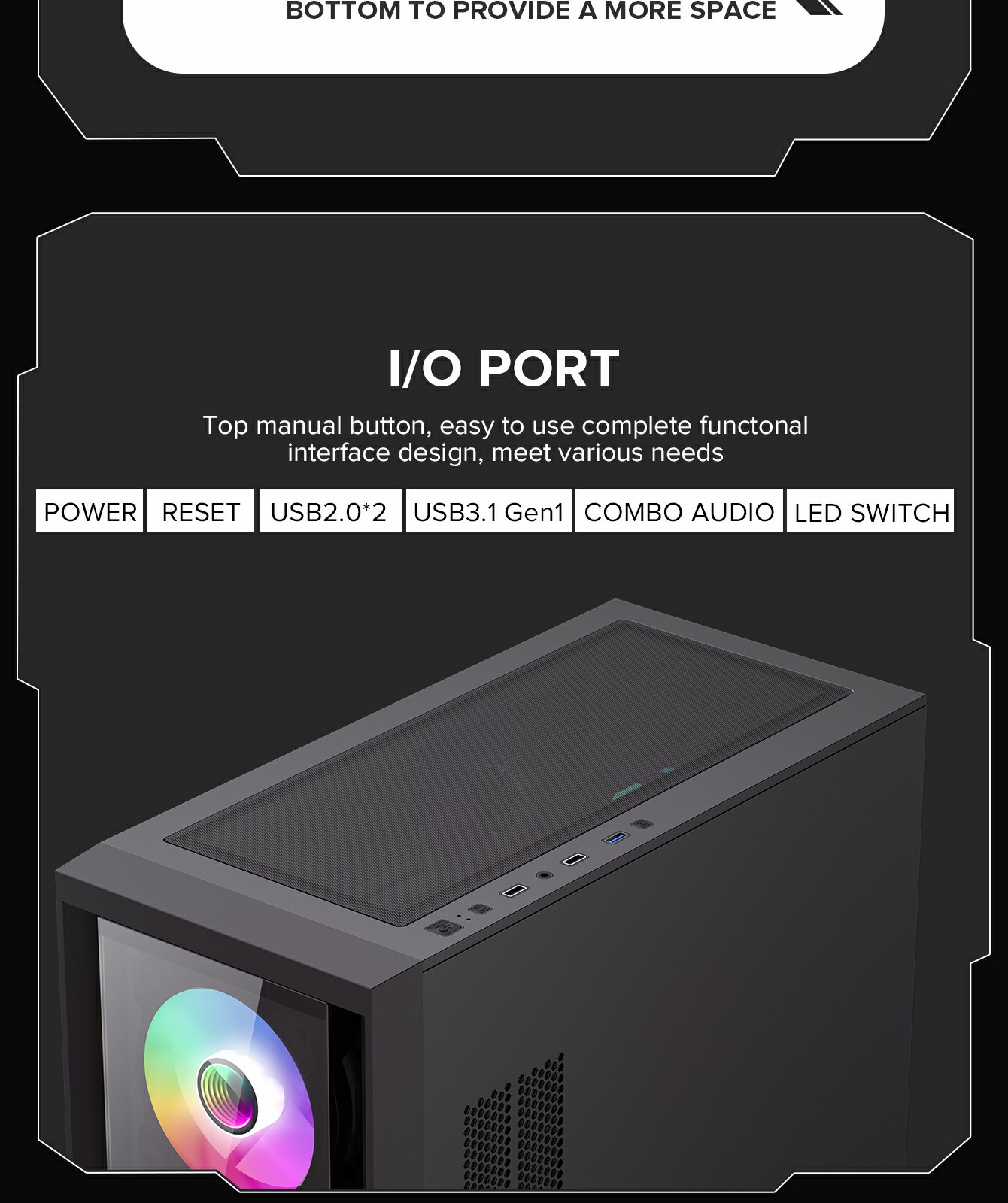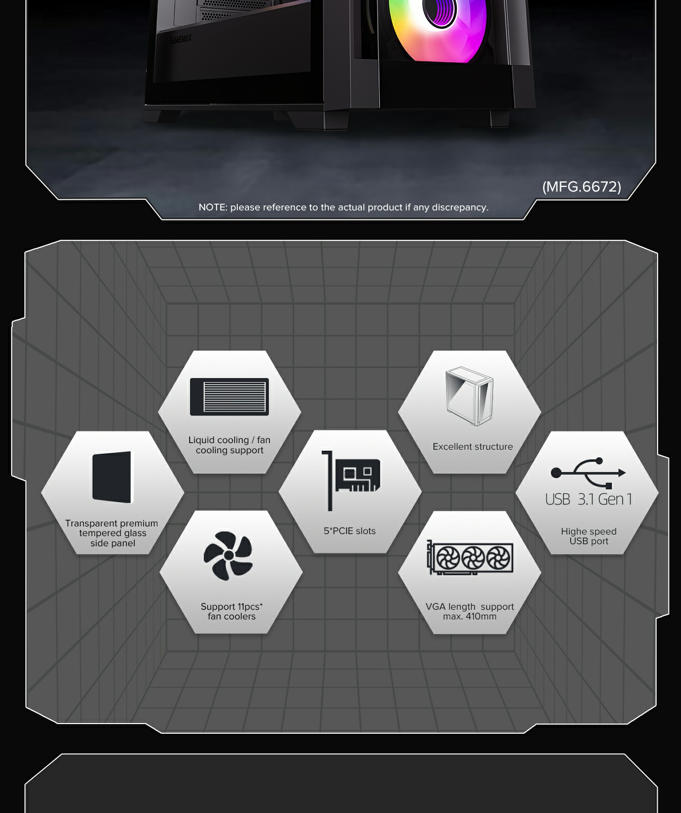 • The side and front high transparent glass will help you build the coolest computer chassis.5xPCIe Slot position, born for thicker RTX-40xx series GPU card, leaves additional space to increase cooling of the video card and improve performance and stability