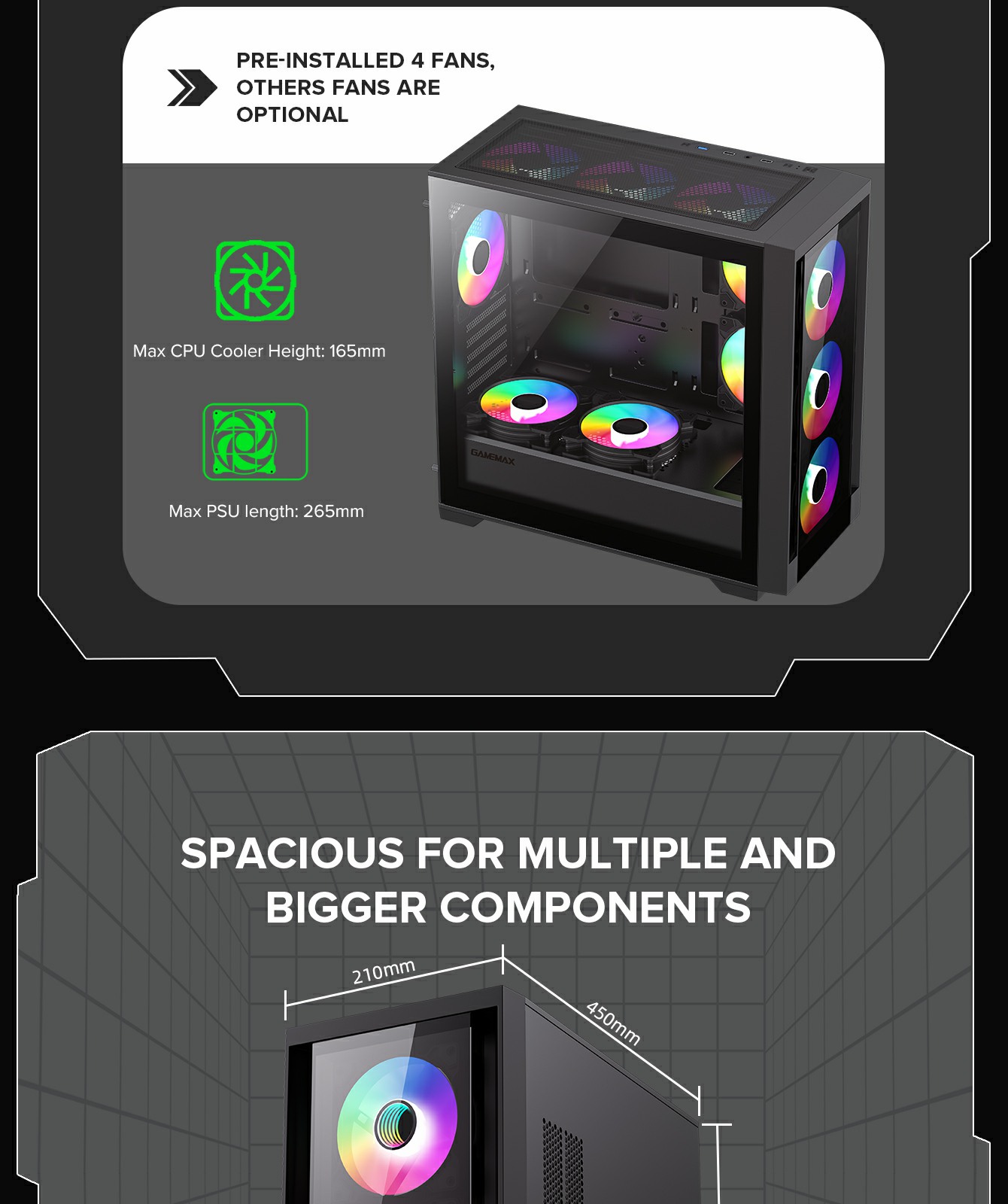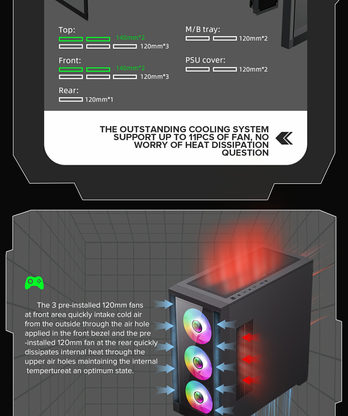• Extreme Cooling Performance: With 4x 120mm ARGB fans in the front 3x120mm ARGB fans at the rear 1x120mm ARGB Fan, keeps temps in control even during high loads