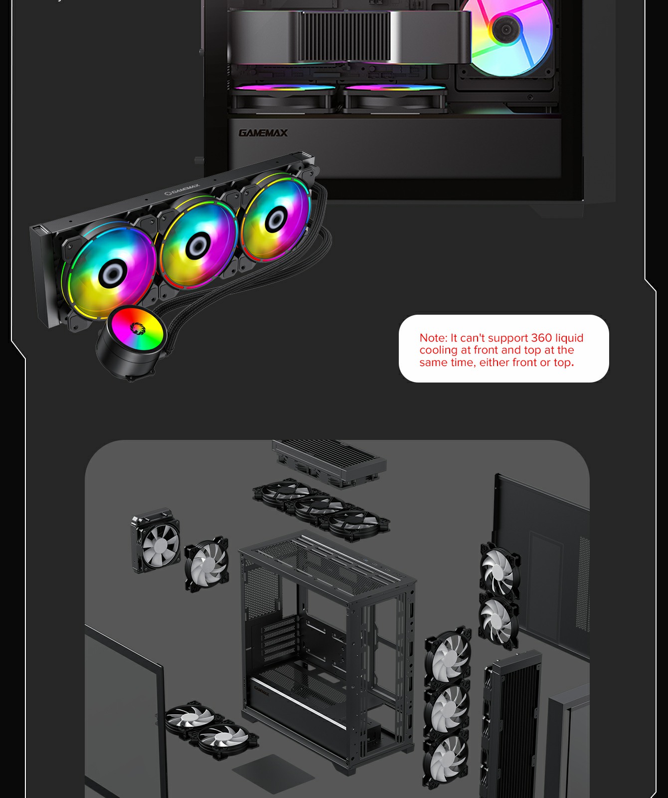 | Water Cooling Support (Radiator Size) | Front | 120mm, 140mm,240mm,280mm,360mm |