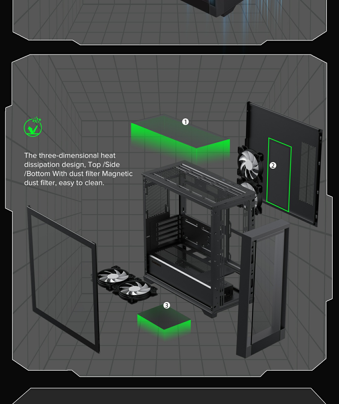 | Dust Cover | Bottom, right side panel and top cover with dust filter | |