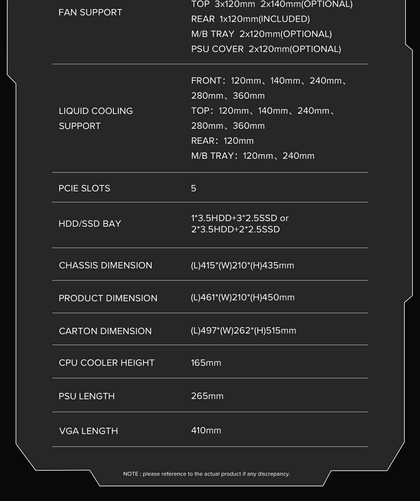 | Dimensions | Chassis | (L)415*(W)210*(H)435mm |
