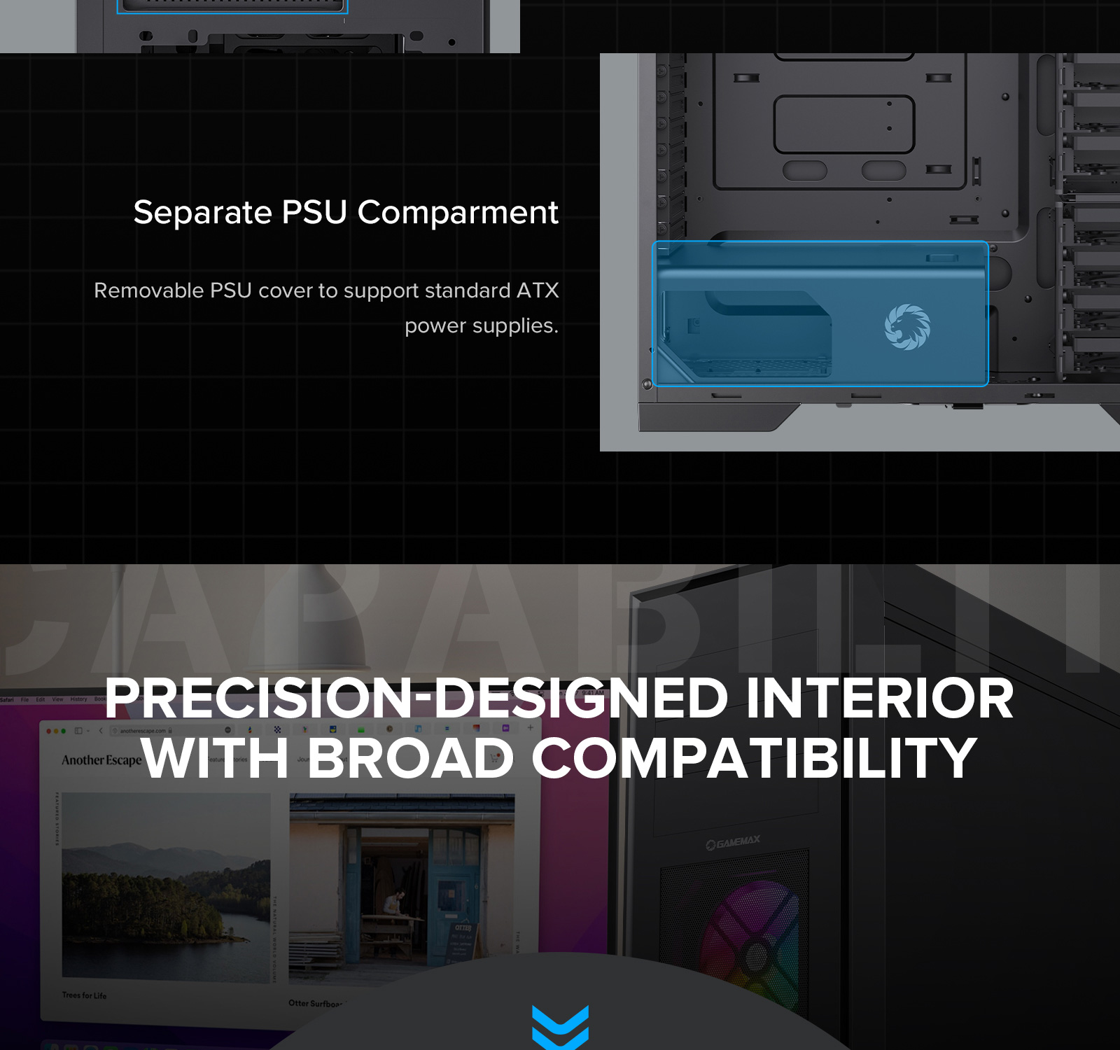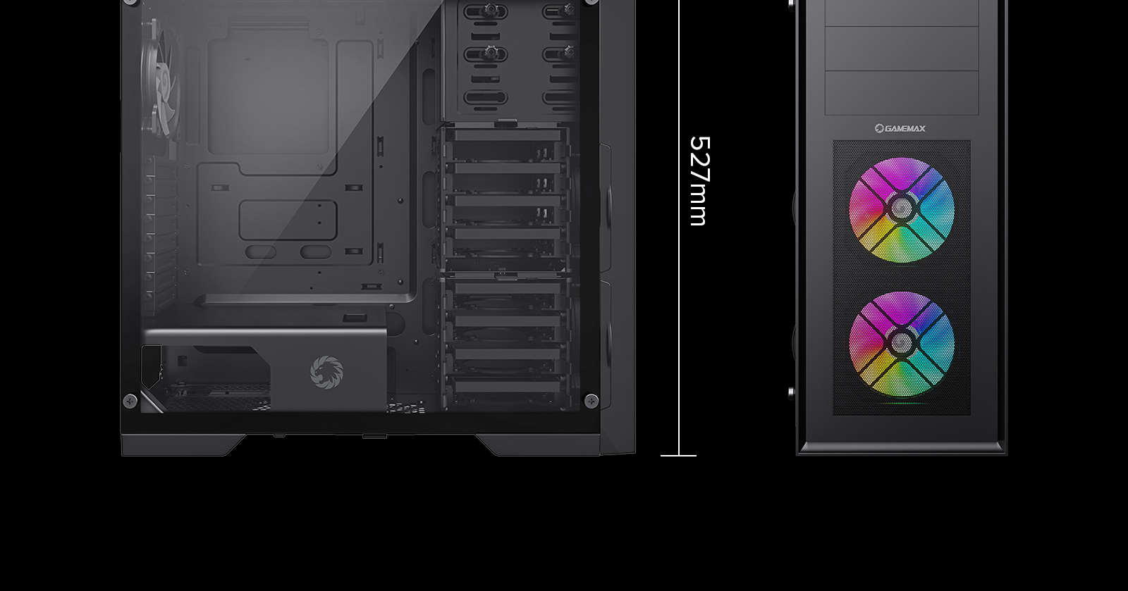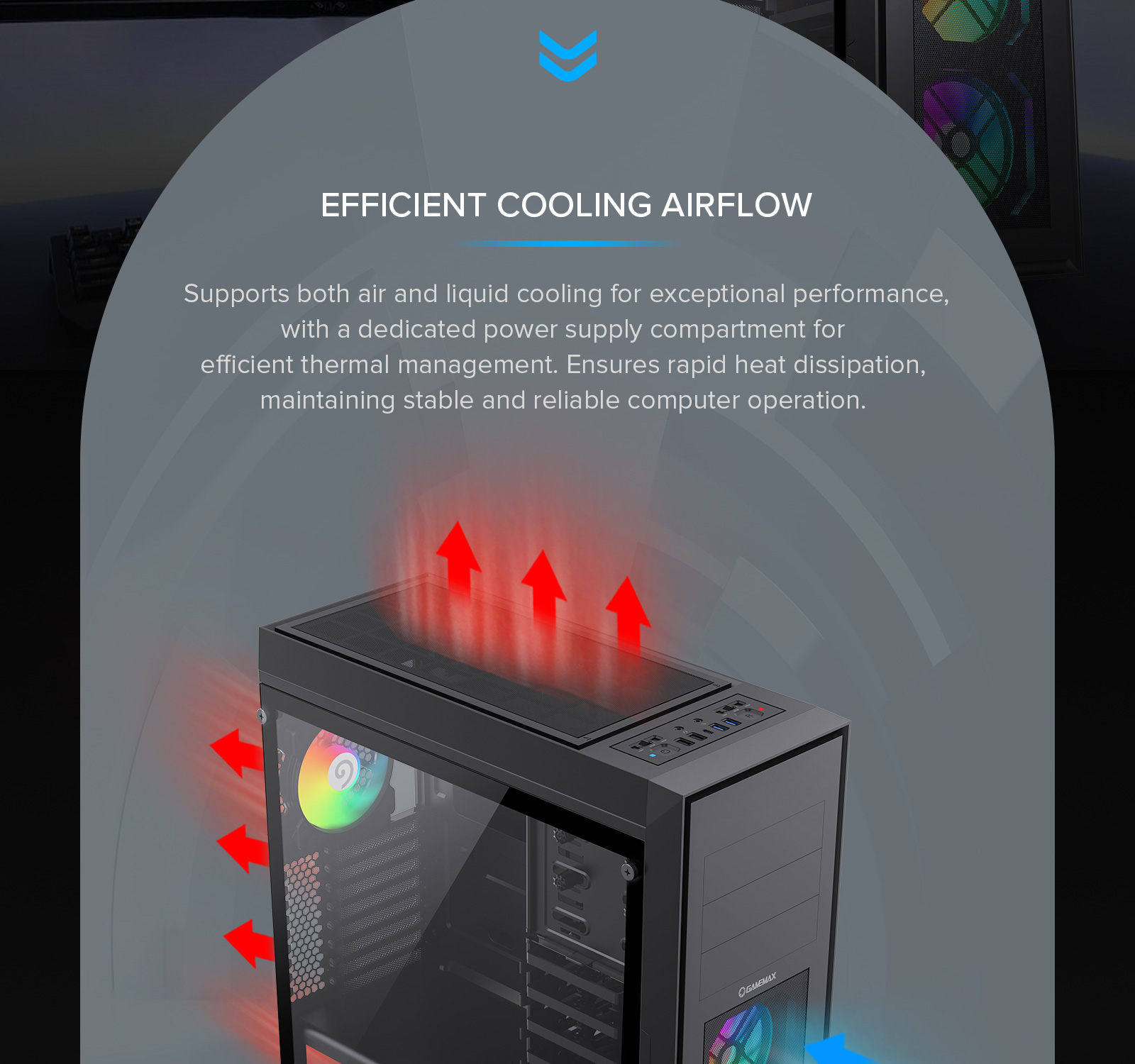 • Efficient Cooling, Pre-installed 120mm front and rear fans, supports up to 8 fans and water cooling (360mm top, 240mm front).
